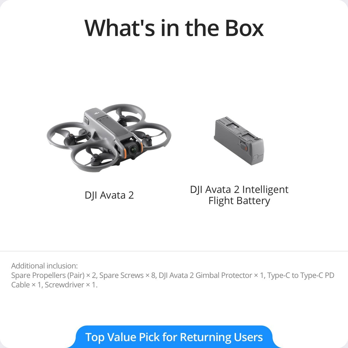 | Included Components | DJI Avata 2 Intelligent Flight Battery x1, DJI Avata 2 x1, DJI Goggles 3 x1, DJI RC Motion 3 x1, Spare Propellers (Pair) x2; Spare Screws x8; DJI Avata 2 Gimbal Protector x1; Type-C to Type-C PD Cable x1; Screwdriver x1; DJI RC Motion 3 Lanyard x1; DJI Goggles 3 Foam Padding x1;DJI Goggles 3 Additional Forehead Pad x1; DJI Goggles 3 -2.0D Corrective Lenses (Pair) x1; USB-C OTG Cable x1 See more |