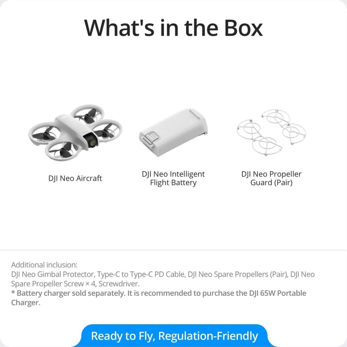 | Included Components | DJI Neo Aircraft x1, DJI Neo Gimbal Protector x1, DJI Neo Intelligent Flight Battery x1, DJI Neo Propeller Guard (Pair) x1, DJI Neo Spare Propeller Screw x4, DJI Neo Spare Propellers (Pair) x1, Screwdriver, Type-C to Type-C PD Cable x1 See more |