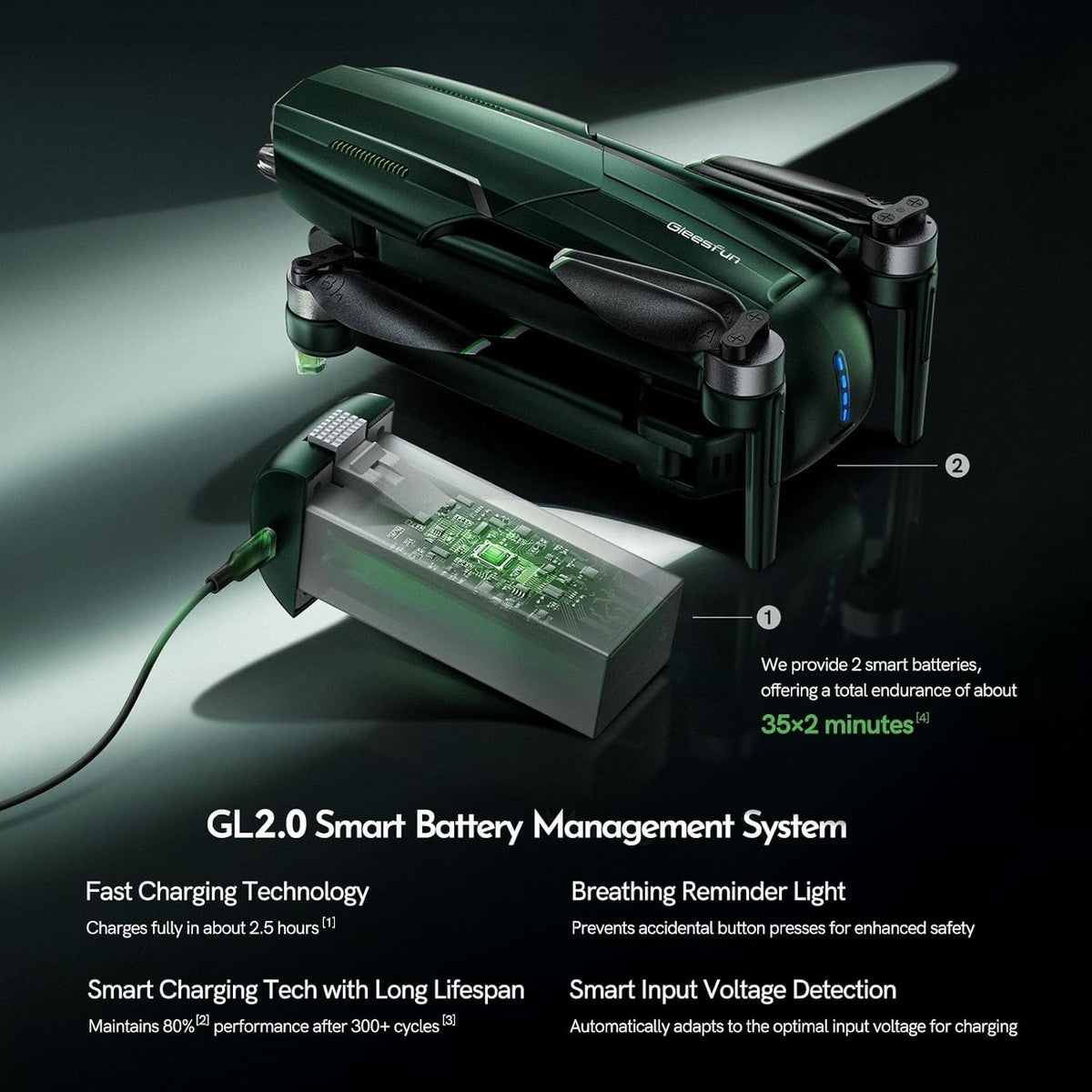 • 【𝗚𝗟𝟮.𝟬 𝗦𝗠𝗔𝗥𝗧 𝗕𝗔𝗧𝗧𝗘𝗥𝗬 𝗠𝗔𝗡𝗔𝗚𝗘𝗠𝗘𝗡𝗧 𝗦𝗬𝗦𝗧𝗘𝗠】Who wants to fly for only 15 minutes, waste 4-5 hours charging,or constant battery swaps? The GL2.0 Smart Battery Management System solves these issues. With about 2.5 hours of fast charging, reduce wait time and get back in the air quickly. Over 300 charge cycles and 80% performance retention extend battery life. The breathing alert light prevents misuse and enhances safety, while the system adjusts charging for stability. It provides up to 35mins x 2 flight time, letting you complete tasks without rushing to land. Fly longer, recharge faster, and benefit from safer, more durable battery life for a worry-free experience.