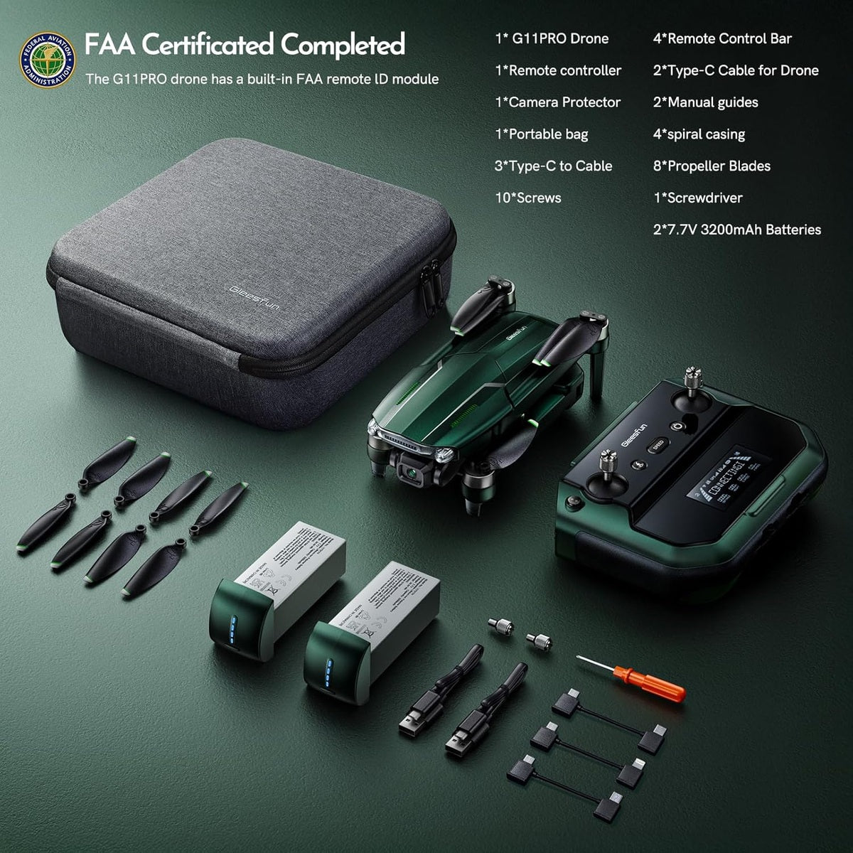 • 【IN SEARCH OF THE IDEAL FLIGHT, CAPTURE YOUR AERIAL MOMENTS】Are you spending more for better aerial footage or choosing a budget drone only to be disappointed by poor image quality? If so, the Gleesfun G11PRO would be ideal for you. This featured affordable drone offers a sleek design, FAA compliance and carrying case for easy transport. With a 3-axis brushless gimbal for smooth flight, a 10000ft range GQ2.0 digital transmission system, and up to 70mins of flight time, it delivers exceptional performance. The camera captures 4K/30fps video & 6K photo with stunning clarity. Cruise modes help you achieve professional-grade shots, easy capturing every frame of your aerial moments.