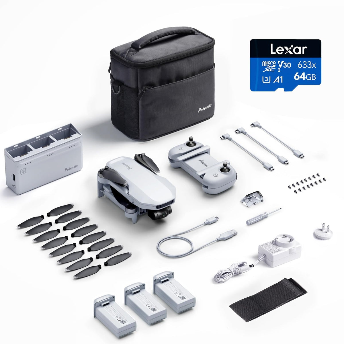 | Included Components | Adapter x 1 ;Screwdriver x 1; 8 Extra Pair of Propellers; 16 Specific Screws of Propeller Blades, Cable(Micro/Type C/Lightning), Parallel Charging Hub x 1 ; Intelligent Batteries x 3; Elastic Strap of Propeller x 1, Portable Handbag x 1๏ผ Camera Protector x 1, Potensic ATOM Drone x 1; Remote Control x 1; ๐๐๐๐ ๐ฆ๐ข๐๐ซ๐จ ๐๐ ๐๐๐ซ๐ ๐ ๐ See more |