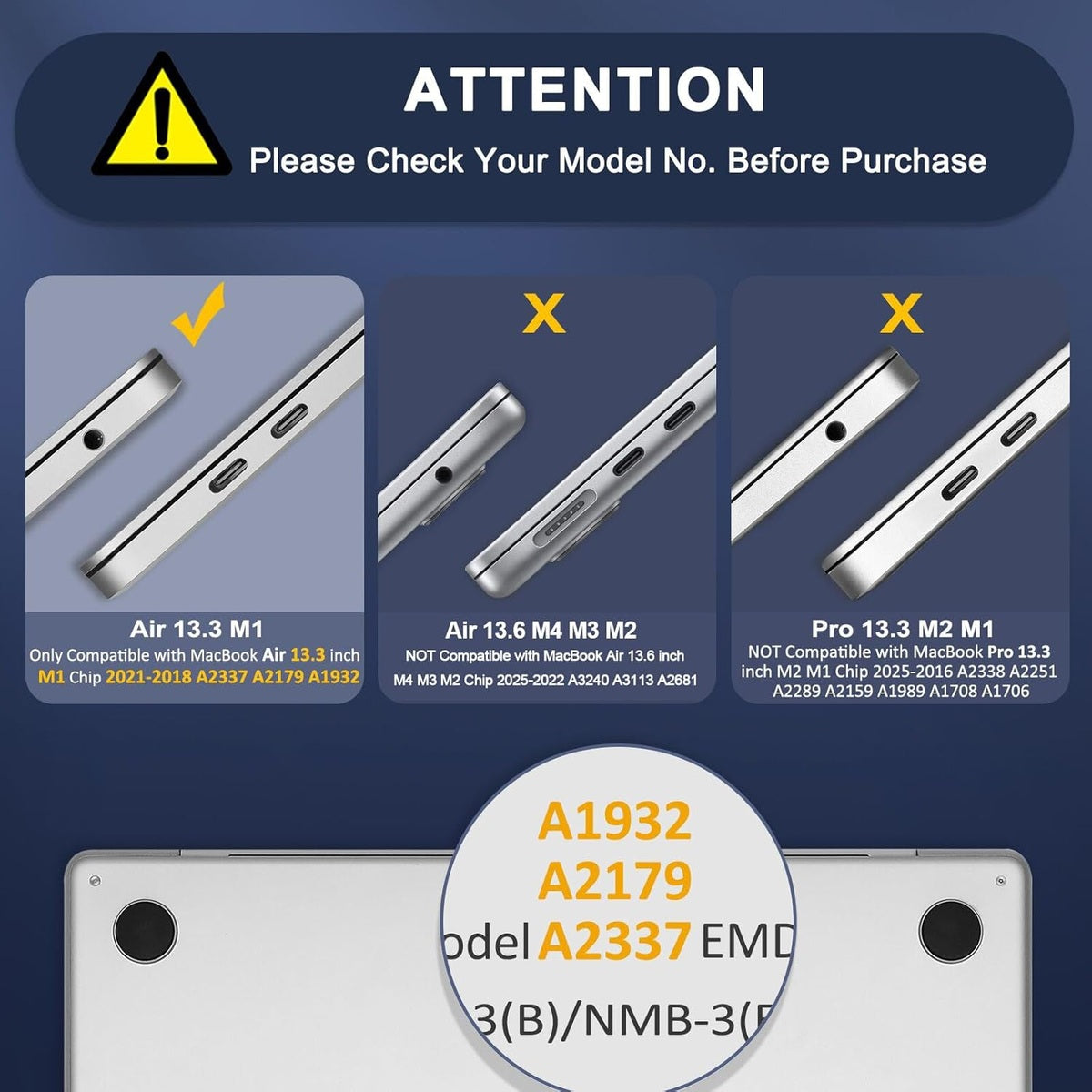 • Designed ONLY to be compatible with MacBook Air 13 inch with Retina Display and Touch ID 2021 2020 2019 2018 Release (Models: A2337 M1 A2179, A1932 - MGN63LL/A, MGND3LL/A, MGN93LL/A, MGN73LL/A, MGNE3LL/A, MGNA3LL/A, MWTJ2LL/A, MVH22LL/A, MWTL2LL/A, MWTK2LL/A, MVH52LL/A, MVH42LL/A, MVFH2LL/A, MVFM2LL/A, MVFK2LL/A, MVFJ2LL/A, MVFN2LL/A, MVFL2LL/A, MRE82LL/A, MREE2LL/A, MREA2LL/A, MRE92LL/A, MREF2LL/A, MREC2LL/A). WARNING: This case is NOT compatible with other model laptops.