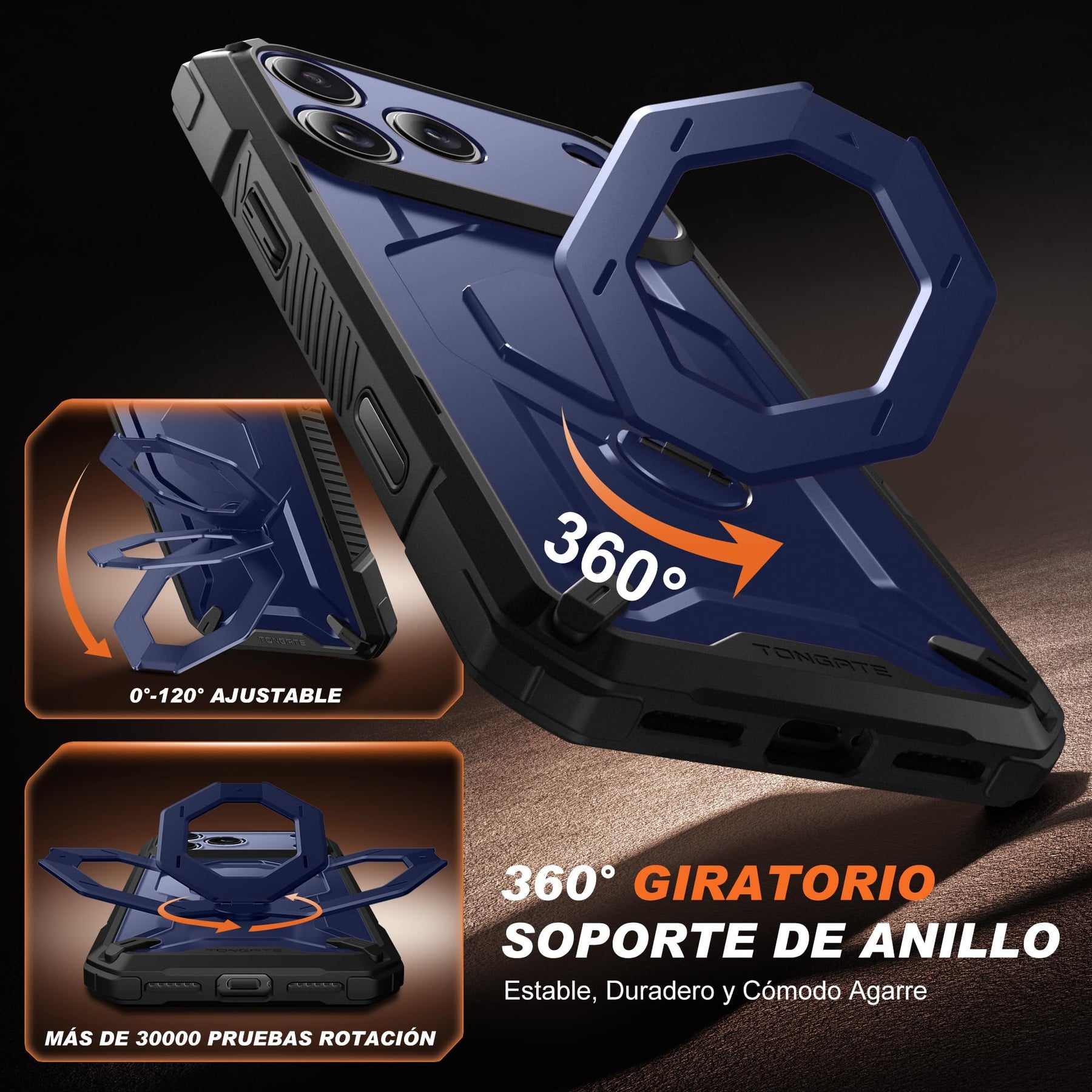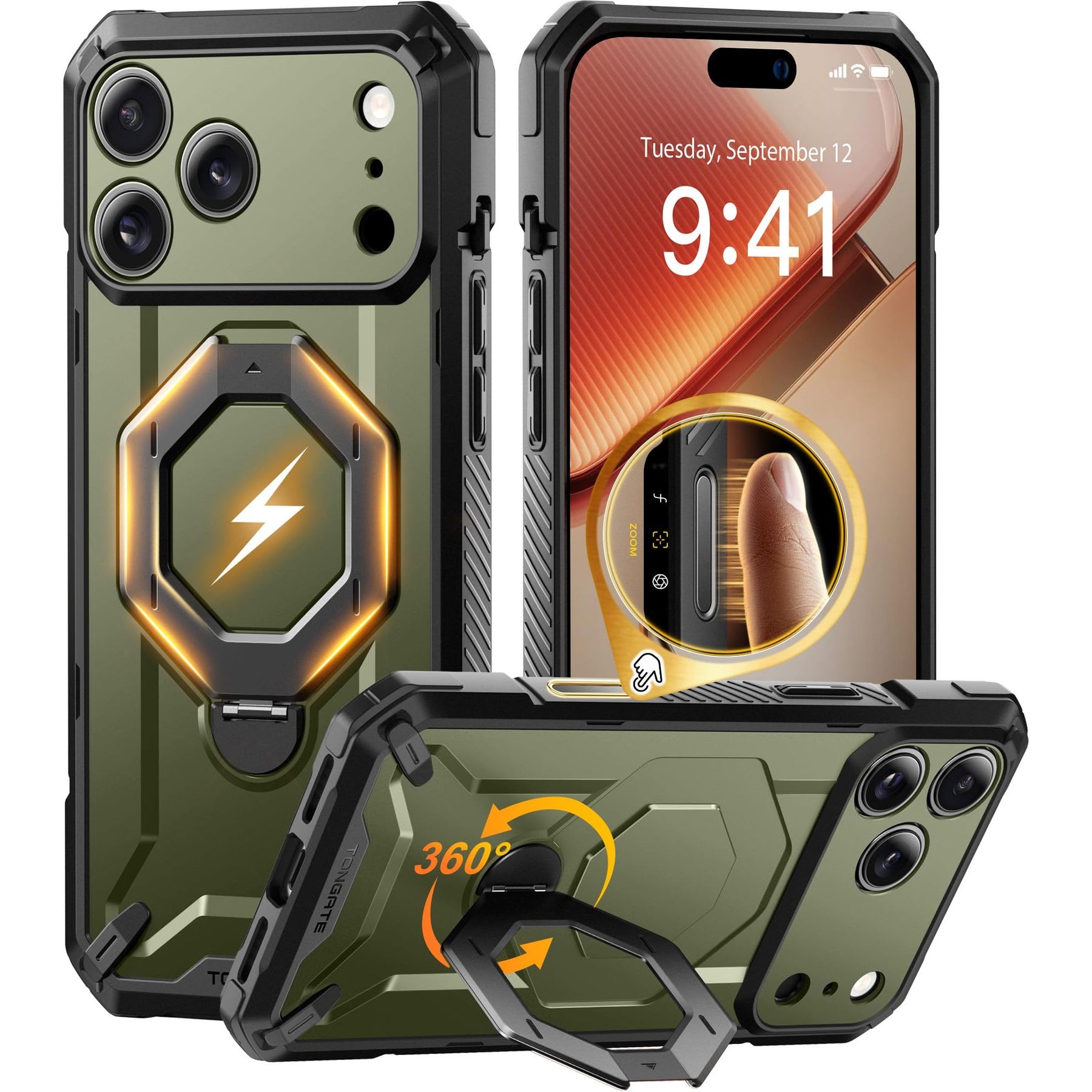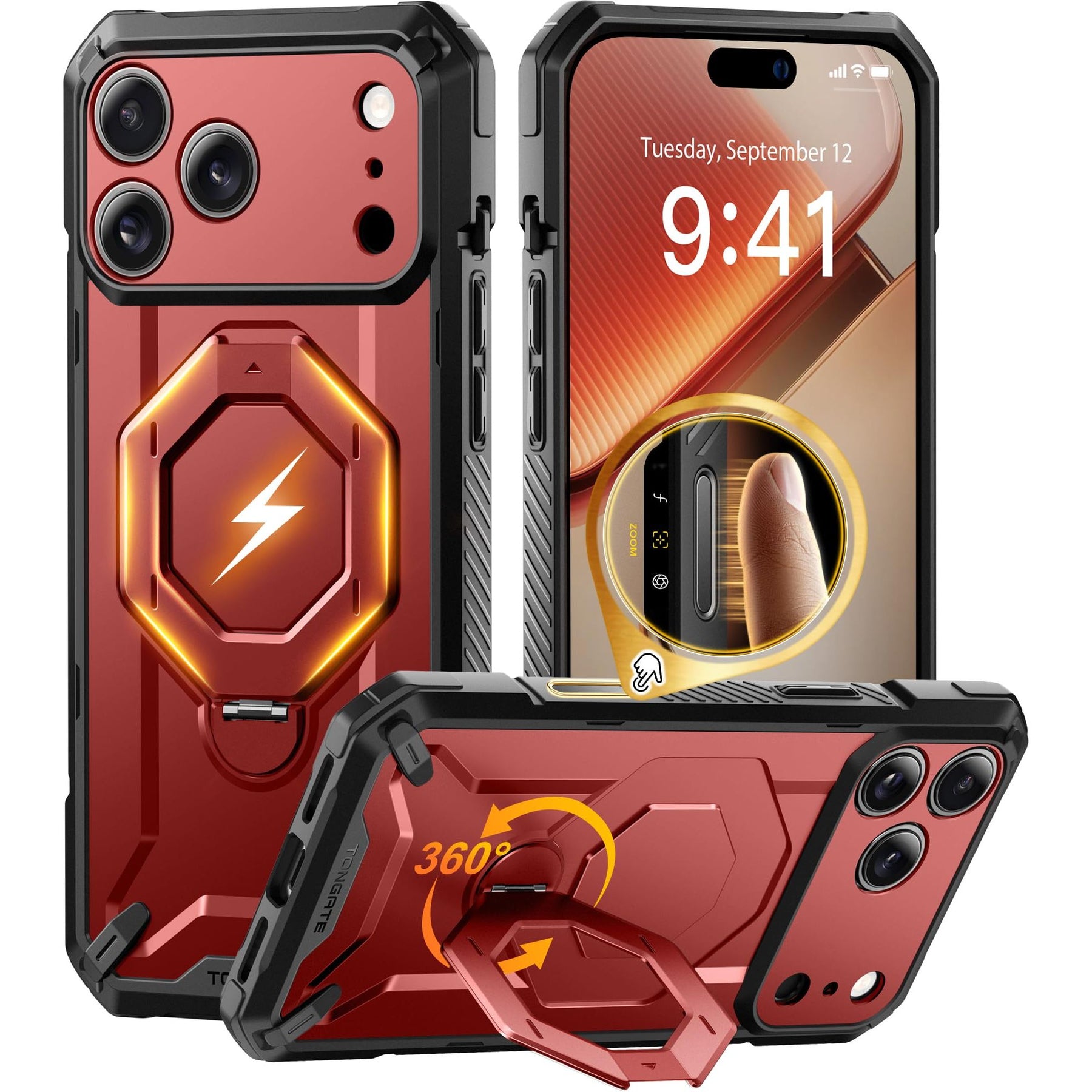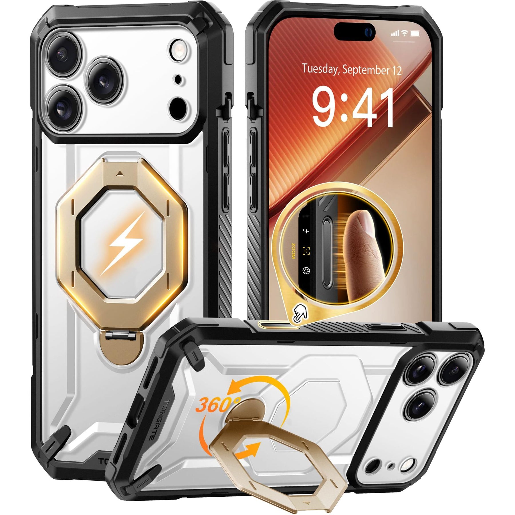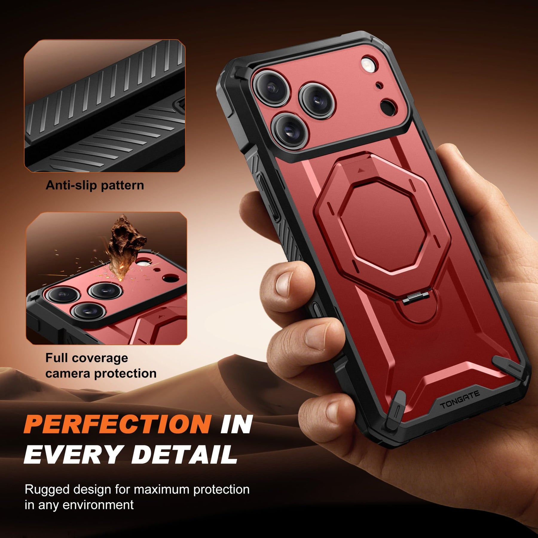 [Precise Camera Buttons and Secure Grip] The TONGATE 17 Pro Max phone case features fully covered camera buttons with a smooth, responsive feel, effectively preventing dust and scratches. The rear ring stand is paired with a non-slip textured frame, providing a comfortable and secure grip to prevent accidental drops, making your use more convenient and worry-free.