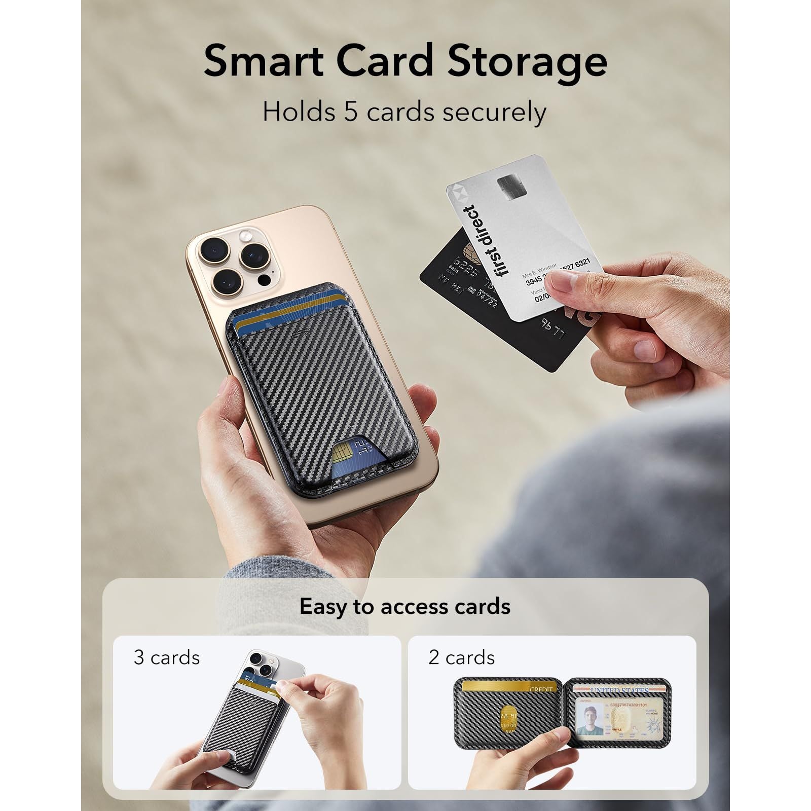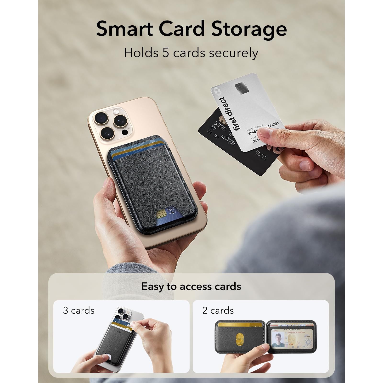 Increased Smart Card Storage: ESR classic magsafe wallet holds 5 cards securely with 3 individual card slots, a clear ID window for daily needs, and includes a 20 mm oval card slot at the bottom for easy card access