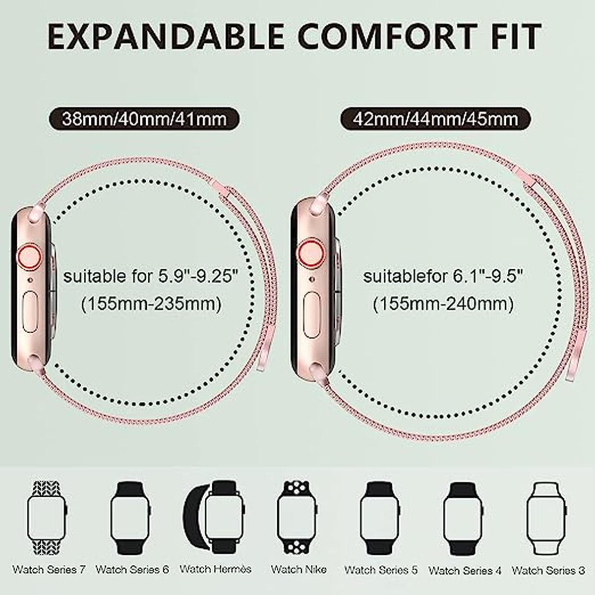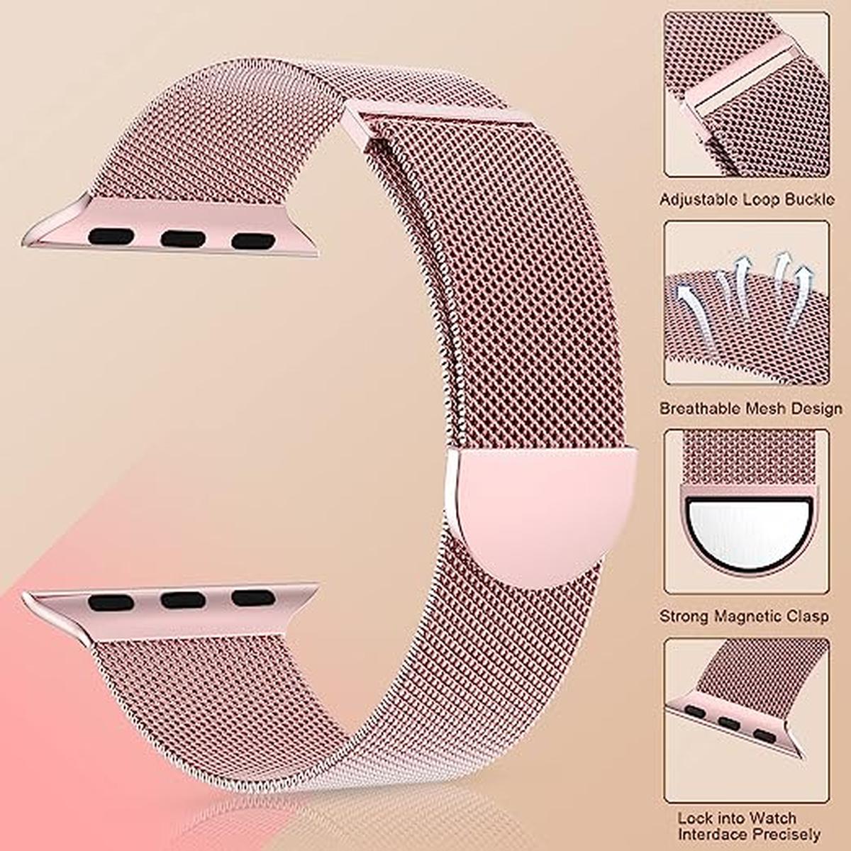 Crafted from high-quality stainless steel, the rose gold mesh band boasts a timeless elegance that complements the luxurious look of your Apple Watch. The unique loop design allows for a customizable fit, ensuring that your watch stays secure while providing all-day comfort. The breathable mesh construction promotes airflow, making it an ideal choice for both workouts and everyday wear.