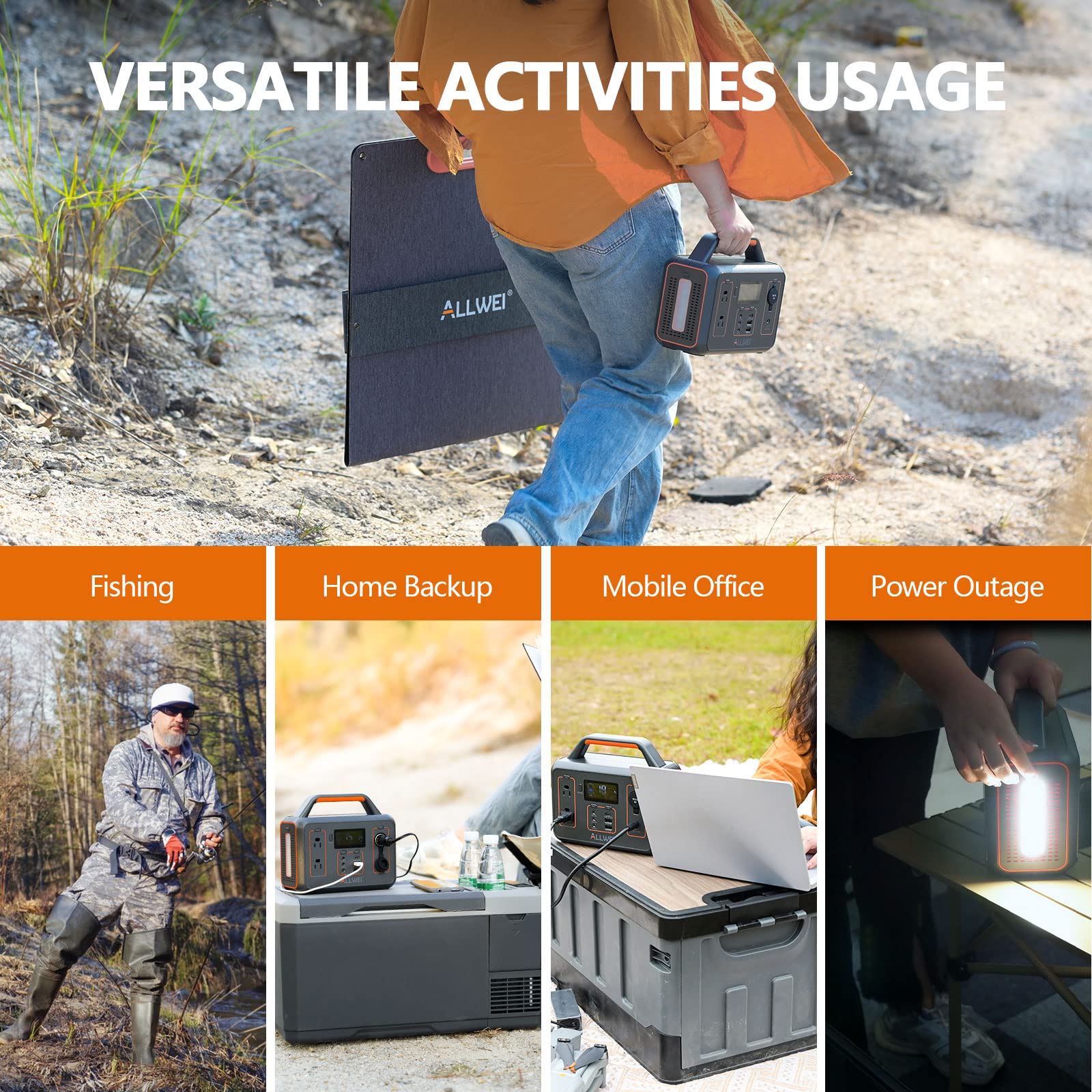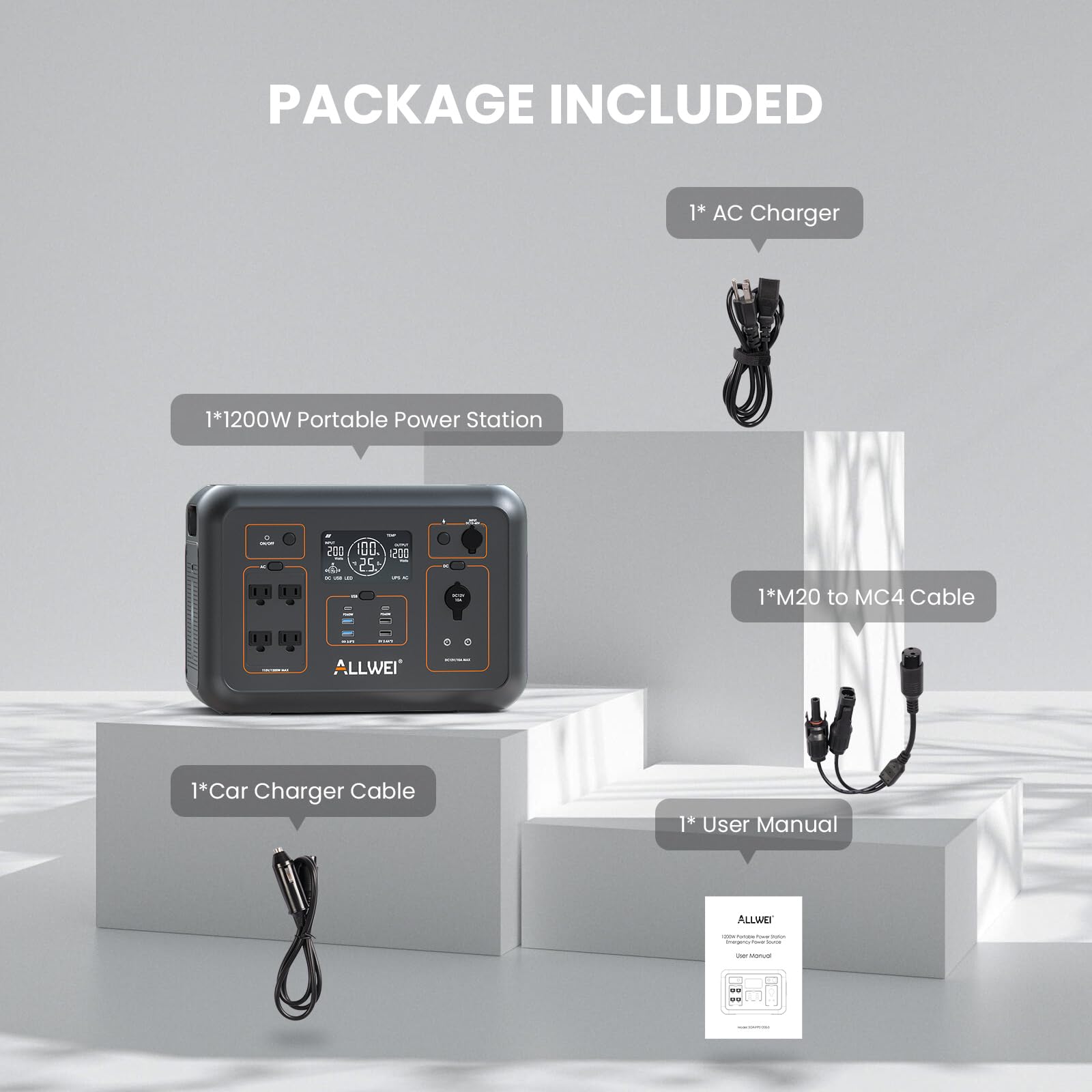 【Package Contents】1x ALLWEI 300W/280Wh Portable Power Station, 1x AC Power Adapter, 1x AC Cable, 1x DC Car Cable, 1x User Manual (ALLWEI Solar Panel sold separately).