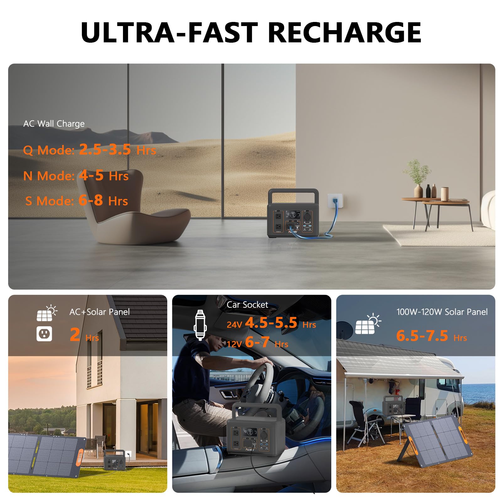 【3 Ways To Recharge, Built-in MPPT Controller】It can be recharged by AC Wall Charging, car charging, and solar panel charging, Fully charged by AC charging: 5.5-6.5 hours, car charging: 4.5-5.5 hours, and 100W solar panel charging: 3-4 hours in full sunlight.