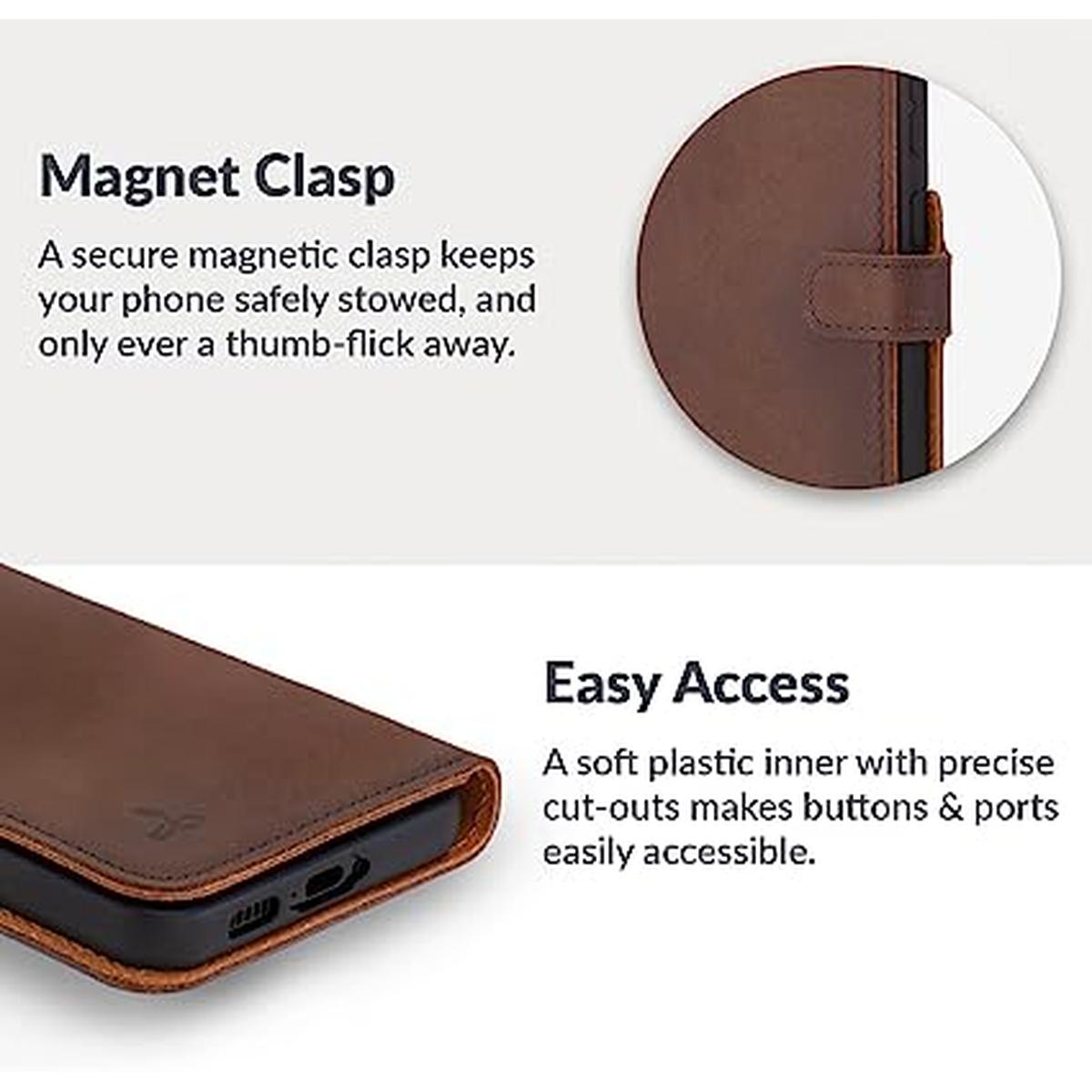 The Snakehive Brown Leather Wallet Case is not just a protective cover for your phone, but also a functional wallet. It has three card slots and a cash pocket, providing you with ample space to carry your essential cards and cash without having to carry a separate wallet. The magnetic closure keeps everything securely in place.