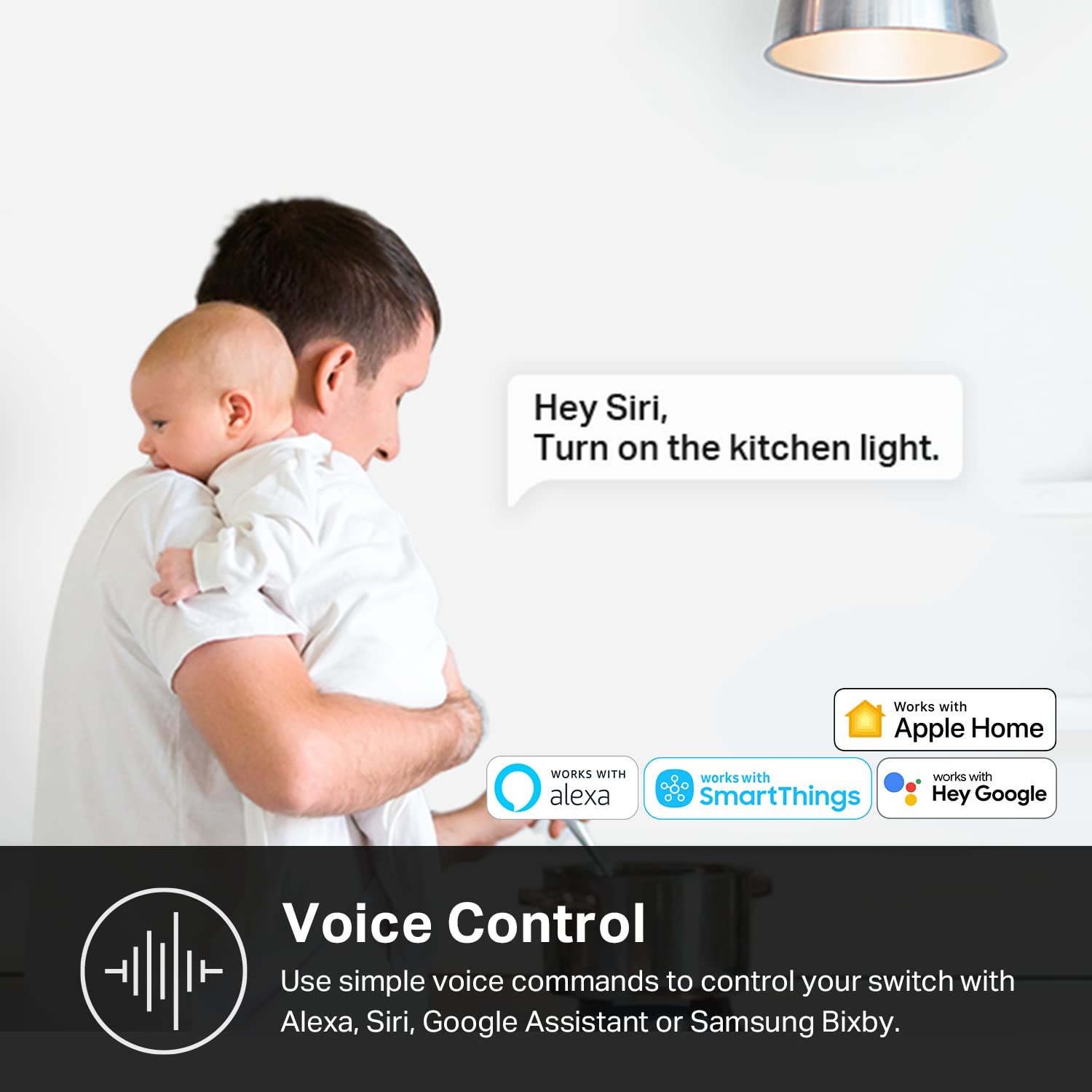 Kasa Apple HomeKit Smart Light Switch, KS200 Control your lights, ceiling fans and other fixtures from anywhere with the KS200. The smart switch replaces most of the standard light switches, and connects to your home Wi-Fi in no time through the free Kasa App. Kasa also lets you manage connected fixtures with your smartphone or tablet, including setting schedules, timers and countdowns. For added convenience, you can use your voice to control the KS200 with Siri, Amazon Alexa and Google assistant. Input Voltage: 100 - 120 VAC, 50/60 Hz, 15 A.