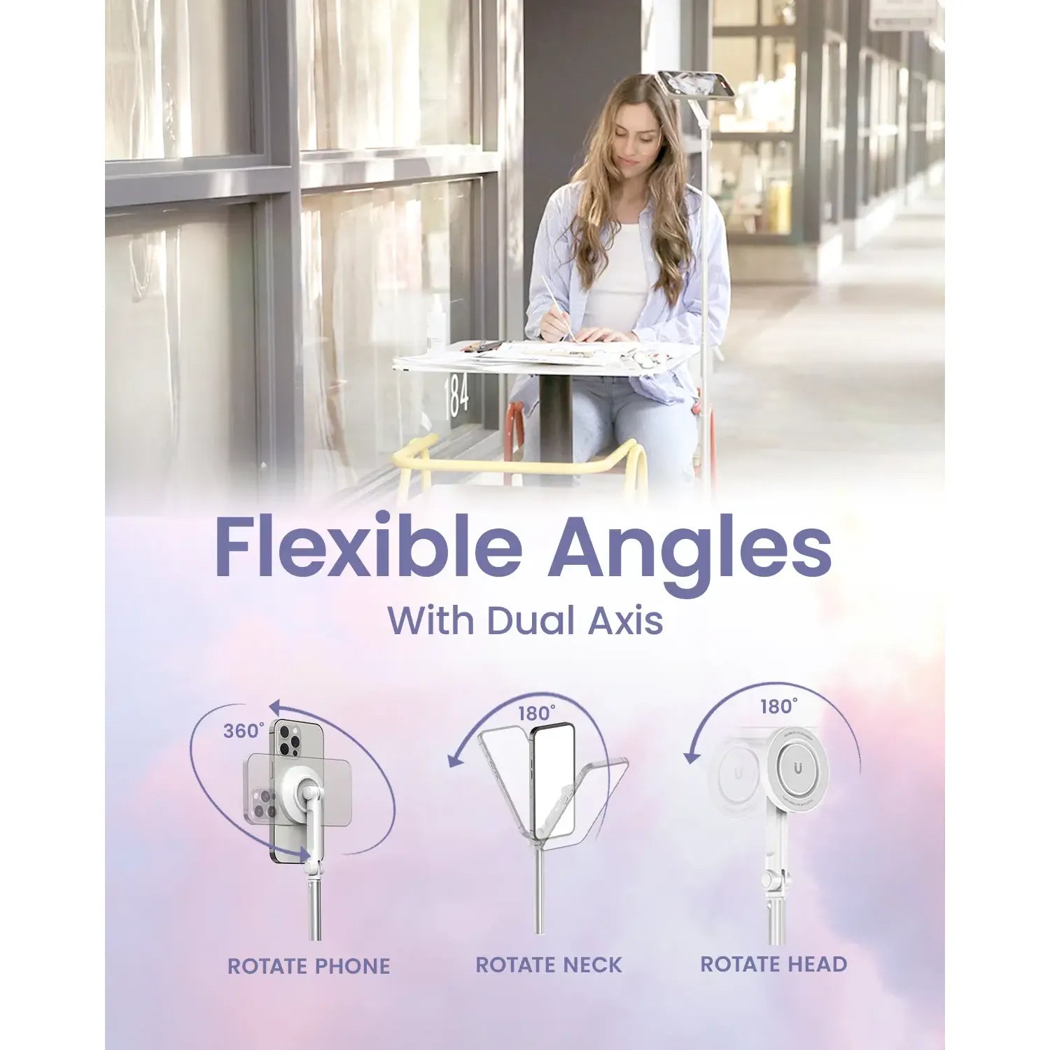 Adjustable Dual Axis Holder: Offering 180° vertical adjustment and phone rotation, this tripod enables a wide range of shooting angles, from overhead and low-angle to landscape and portrait, adapting to any scenario.