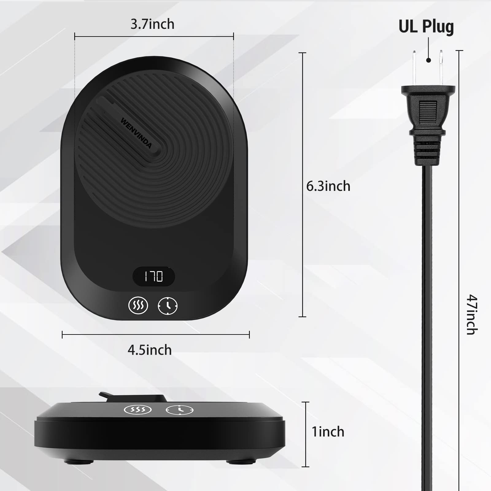 • 2-12H Timed Auto Shutdown Mug Warmer -- The coffee mug warmer with auto shutdown timer will automatically shut down after 4 hours of continuous operation by default. We set up six options of 2-12h according to different use conditions of users. You can set the automatic shutdown time according to your own needs. More convenient and effectively prevent the safety hazards caused by forgetting to close with the coffee warmer.