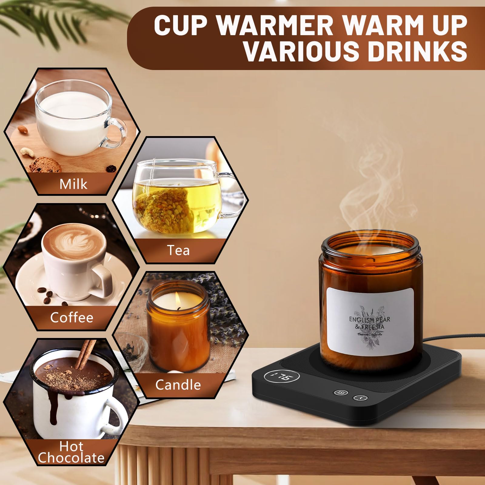 • Coffee Cup Warmer with 3-Tem Settings -- The coffee mug warmer for desk keeps the coffee as hot as you want it to be. There are 3 temperature settings: 170℉/150℉/130℉. You can choose the temperature you want by touching the “Power Button”. With the cup warmer, keeping the drinks warm/hot is no problem.