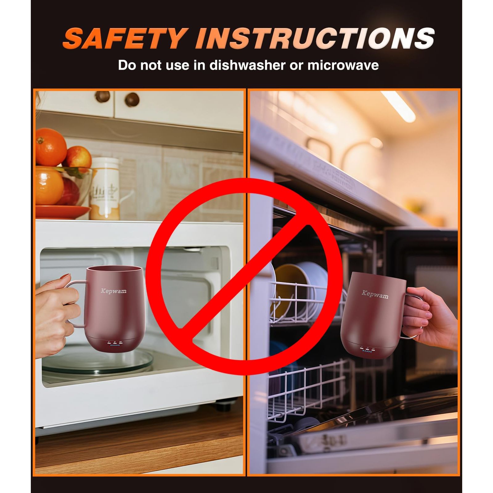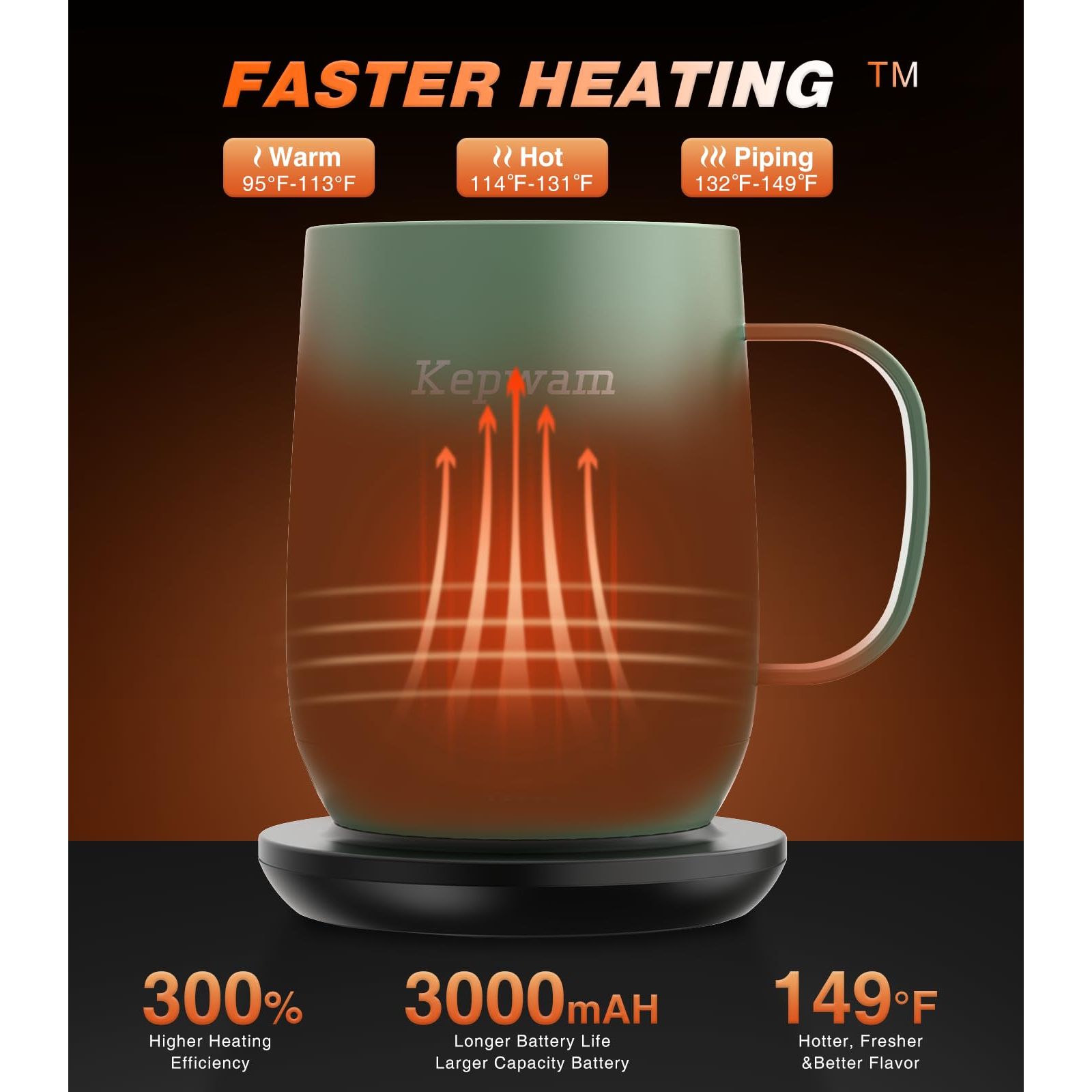 Temperature Control Mug: Chooses from three settings: warm (113°F), hot (131°F), or piping (149°F). Wherever you are, Kepwam keeps your hot coffee, tea, or preferred beverage at the perfect temperature for hours or all day. The included sliding lid keeps your drinks hotter longer while preventing spills