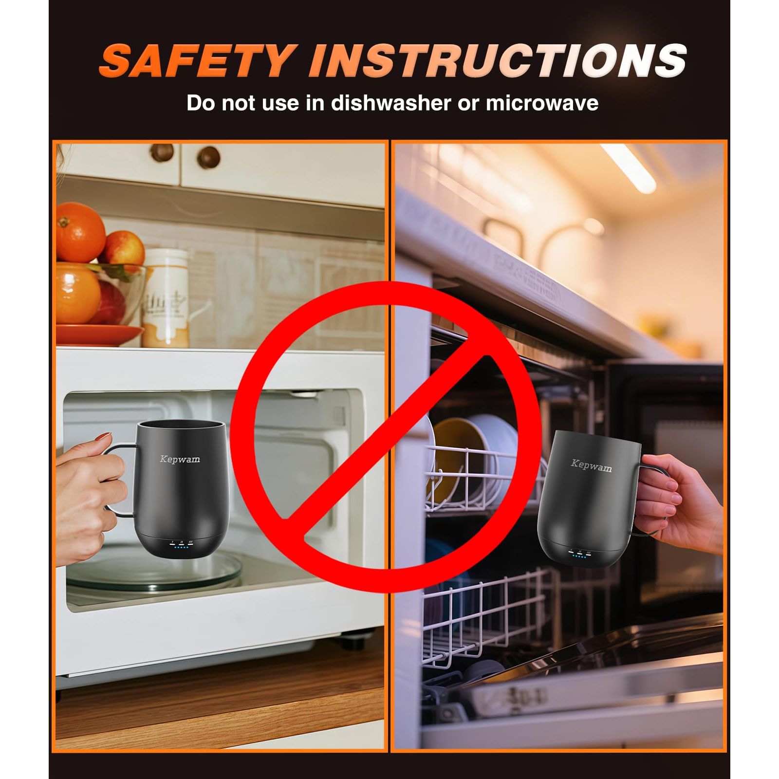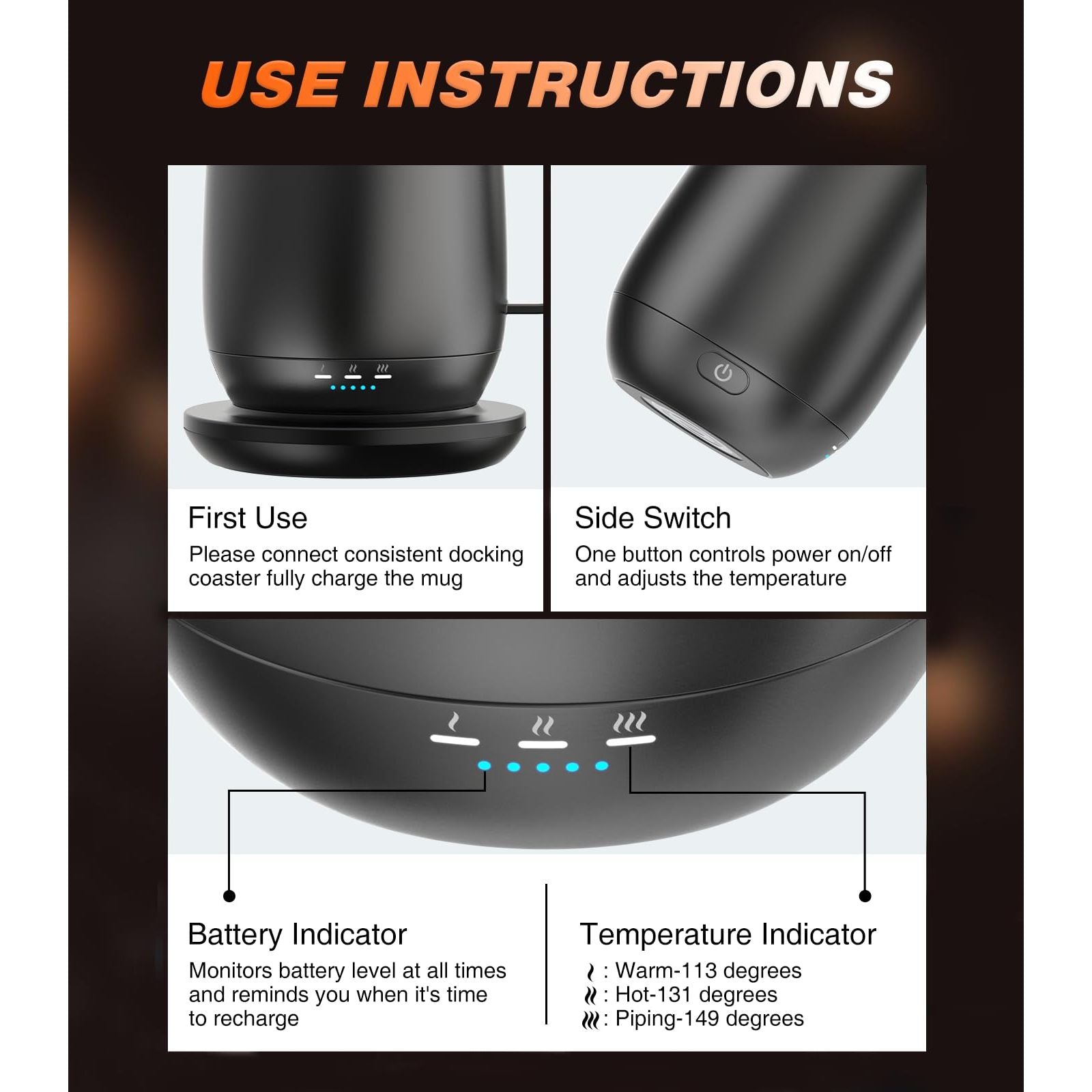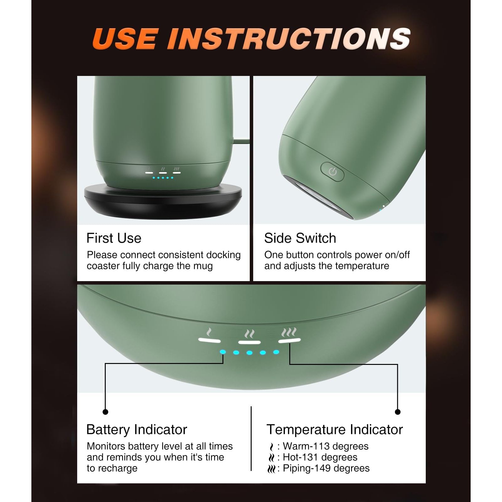 Easy To Operate: Kepwam self heating coffee mug features a one-button design for easy operation. One button can complete the switch and temperature adjustment. Built-in smart display system allows you to view the battery level and temperature status, allowing you to keep track of your usage at all times. No need to connect to the App, more intuitive, more efficient, truly ready to use, enjoy warm drinks at any time