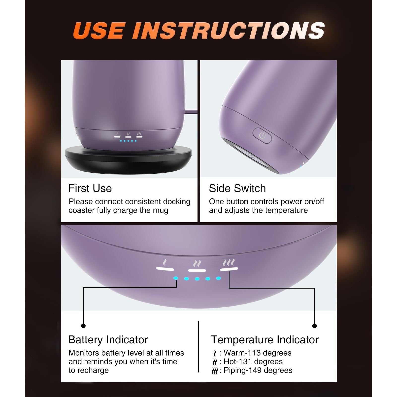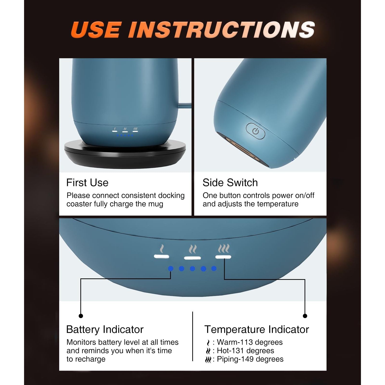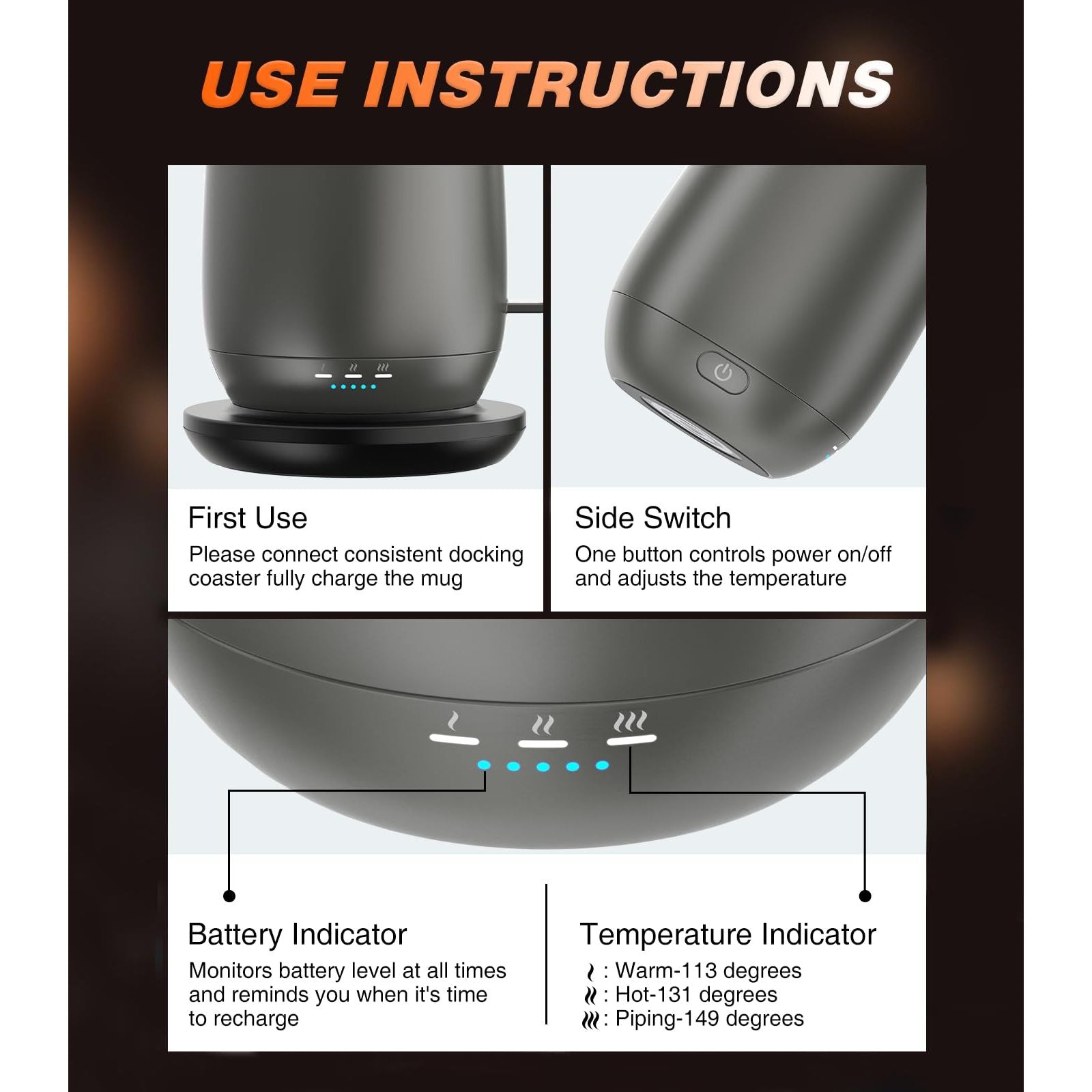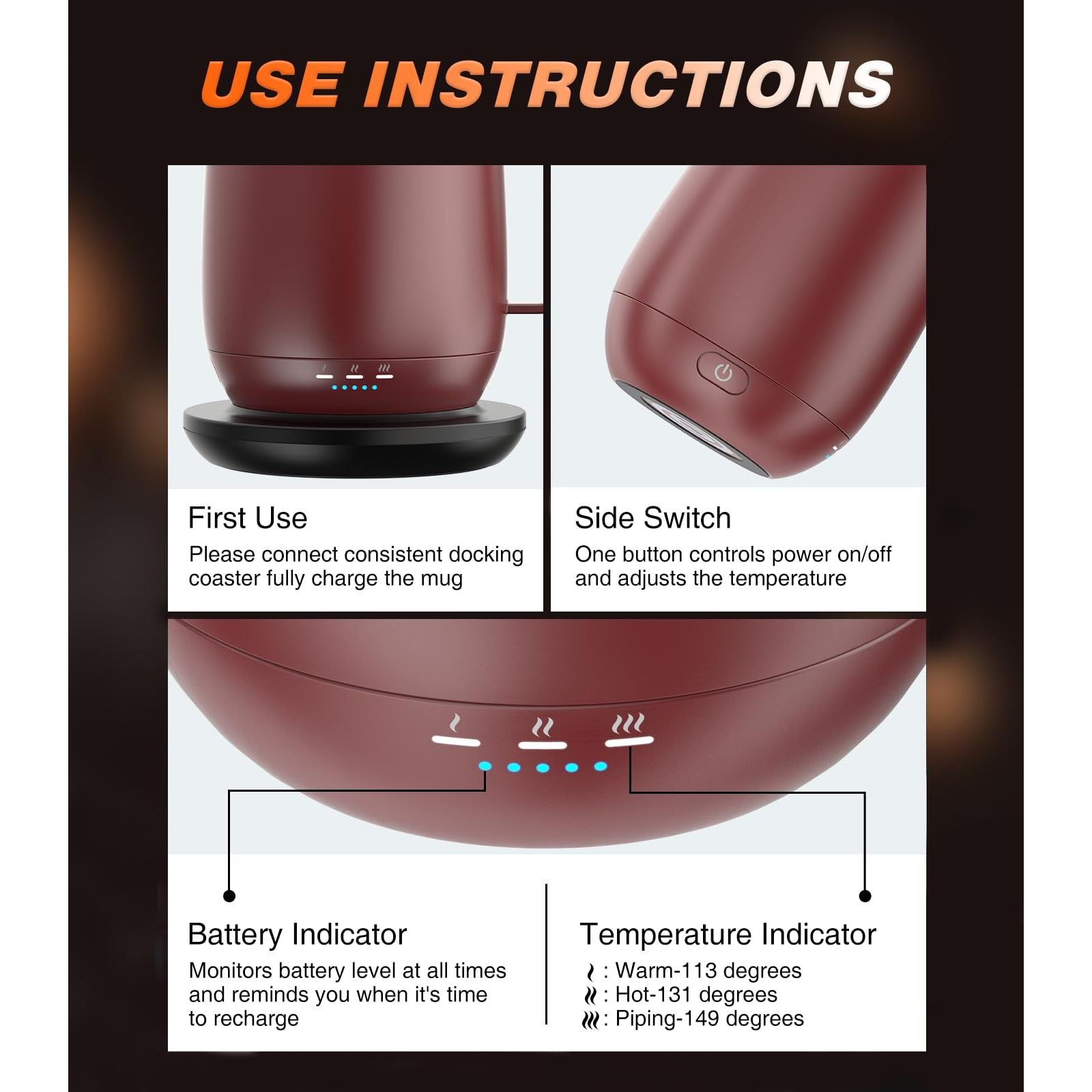 Easy To Operate: Kepwam self heating coffee mug features a one-button design for easy operation. One button can complete the switch and temperature adjustment. Built-in smart display system allows you to view the battery level and temperature status, allowing you to keep track of your usage at all times. No need to connect to the App, more intuitive, more efficient, truly ready to use, enjoy warm drinks at any time