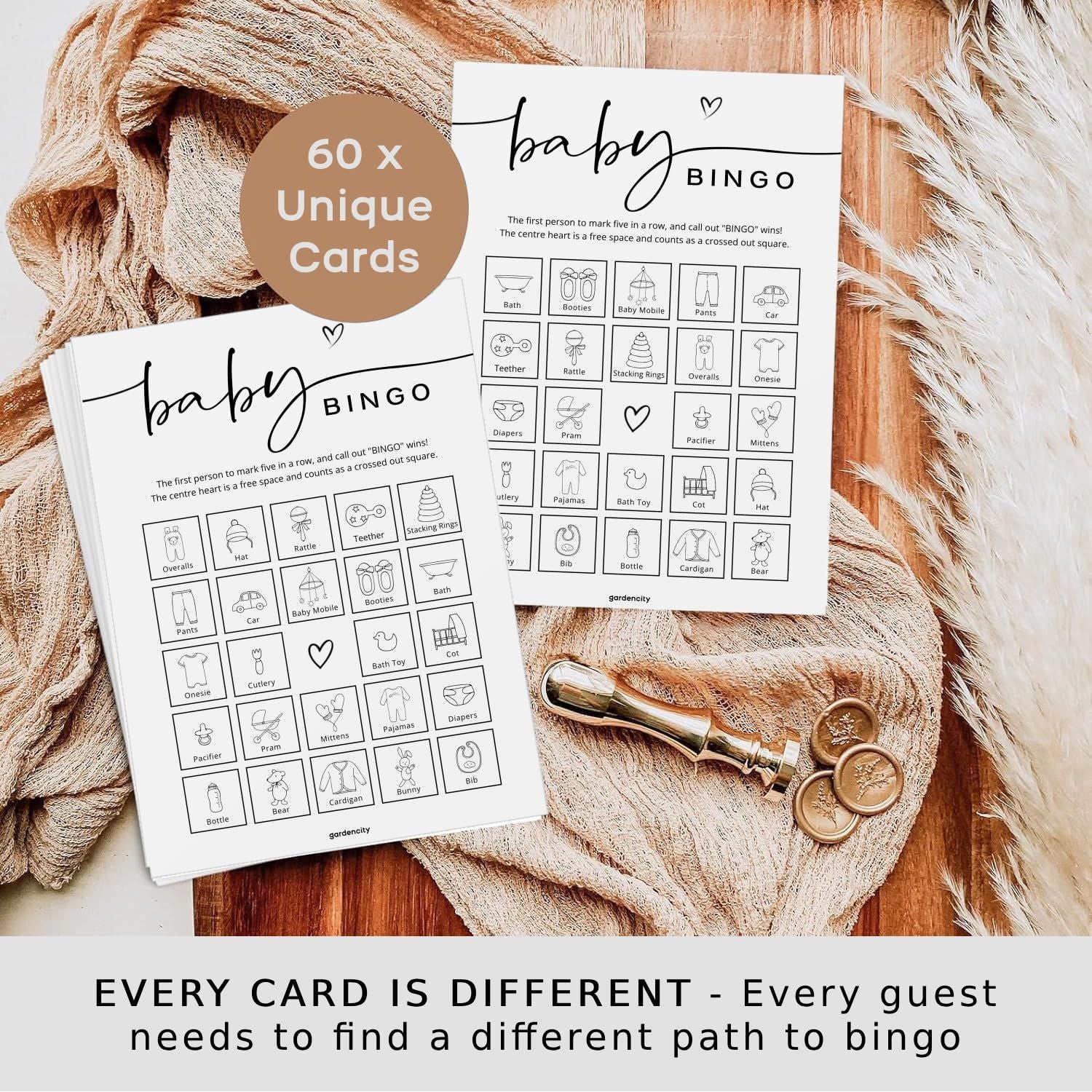 • 60 unique bingo cards: Each card features a delightful assortment of baby-related items, ensuring that no two games are the same!