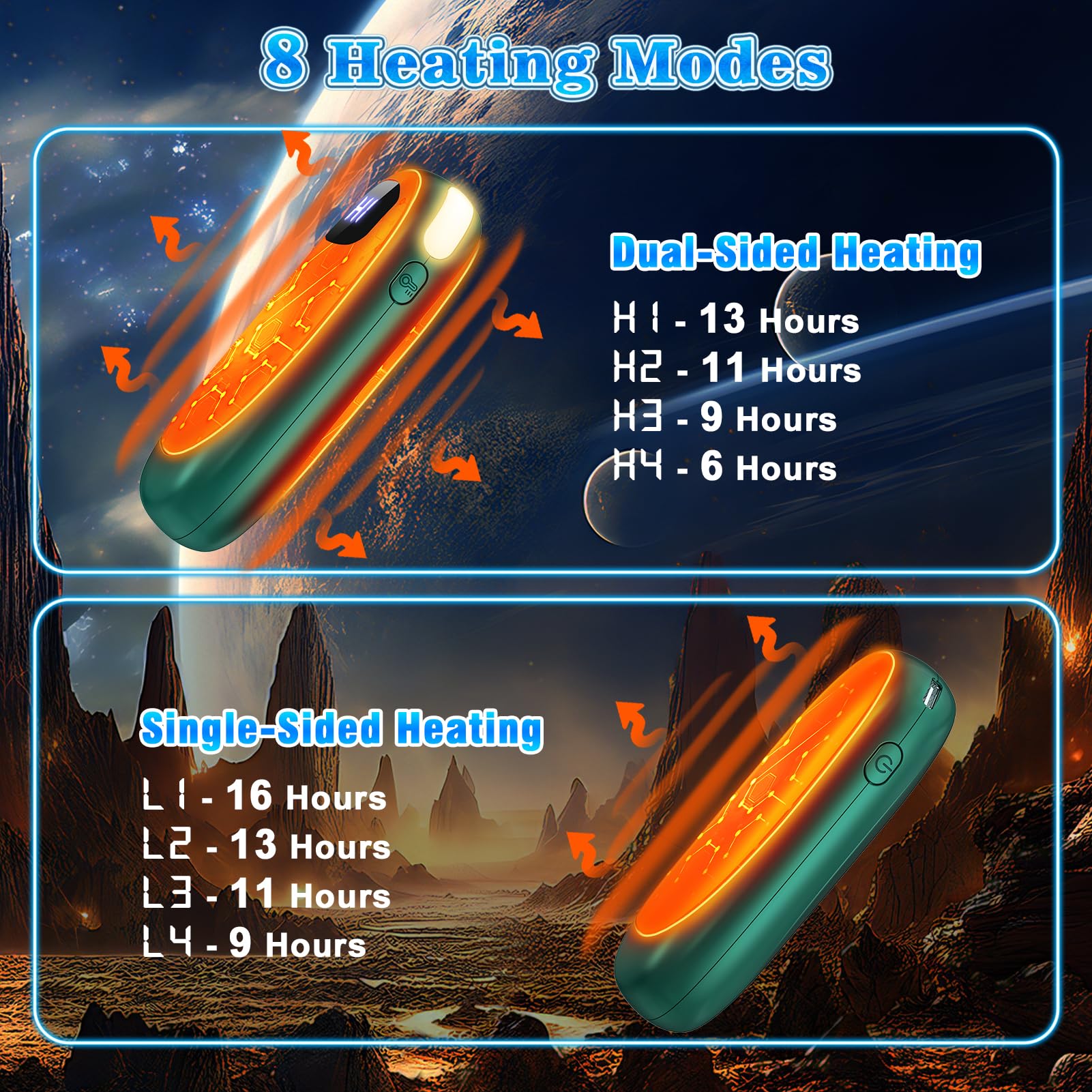 【4 Heat Levels & 8 Heating Modes】Experience our electric hand warmers rechargeable with 4 adjustable levels for both single-side and dual-side heating(108°F/115°F/122°F/131°F), providing a total of 8 heating modes. Whether you're facing chilly outdoor adventures or just need a little extra warmth during everyday activities, our electric hand warmer is the perfect companion, offering a customized heating experience at your fingertips
