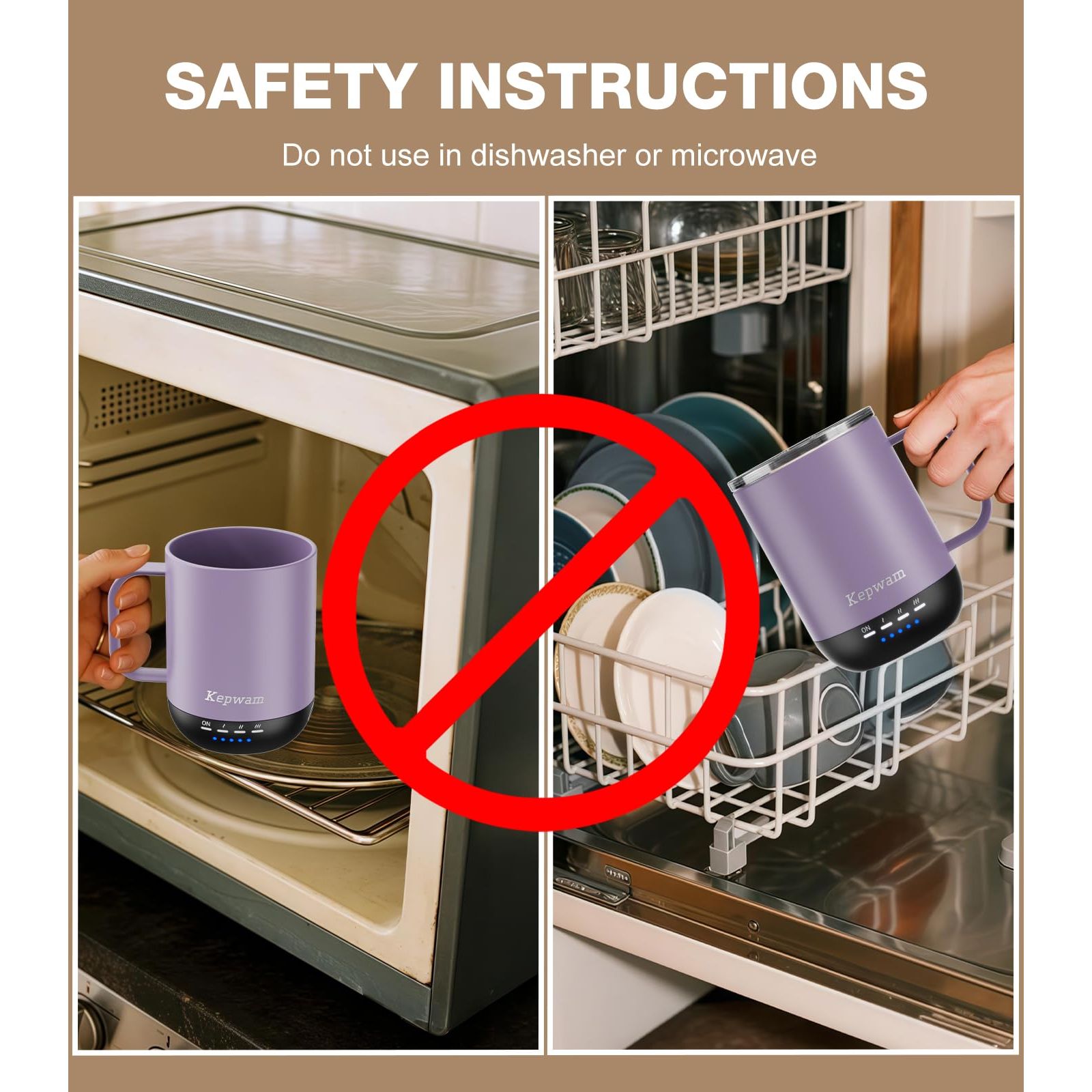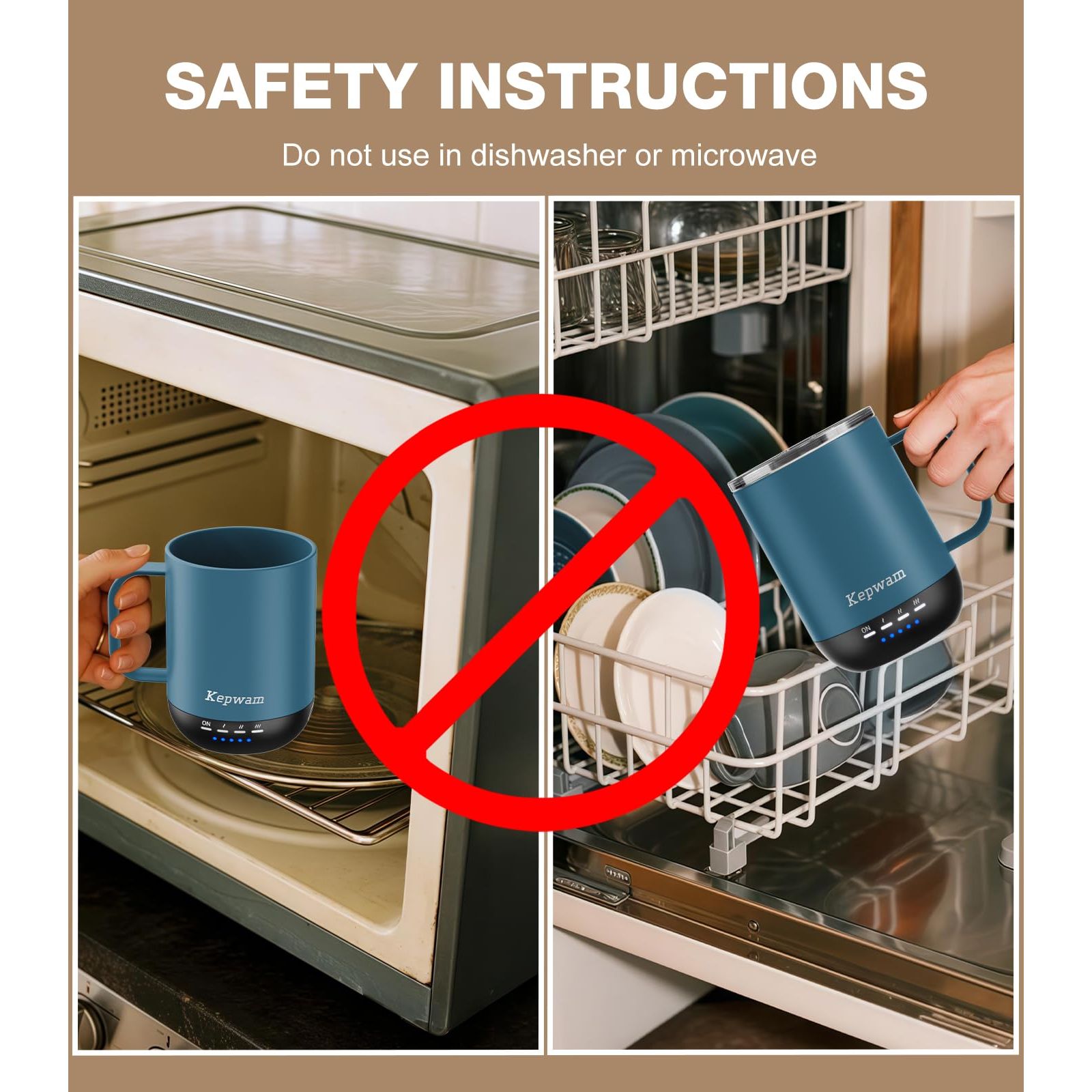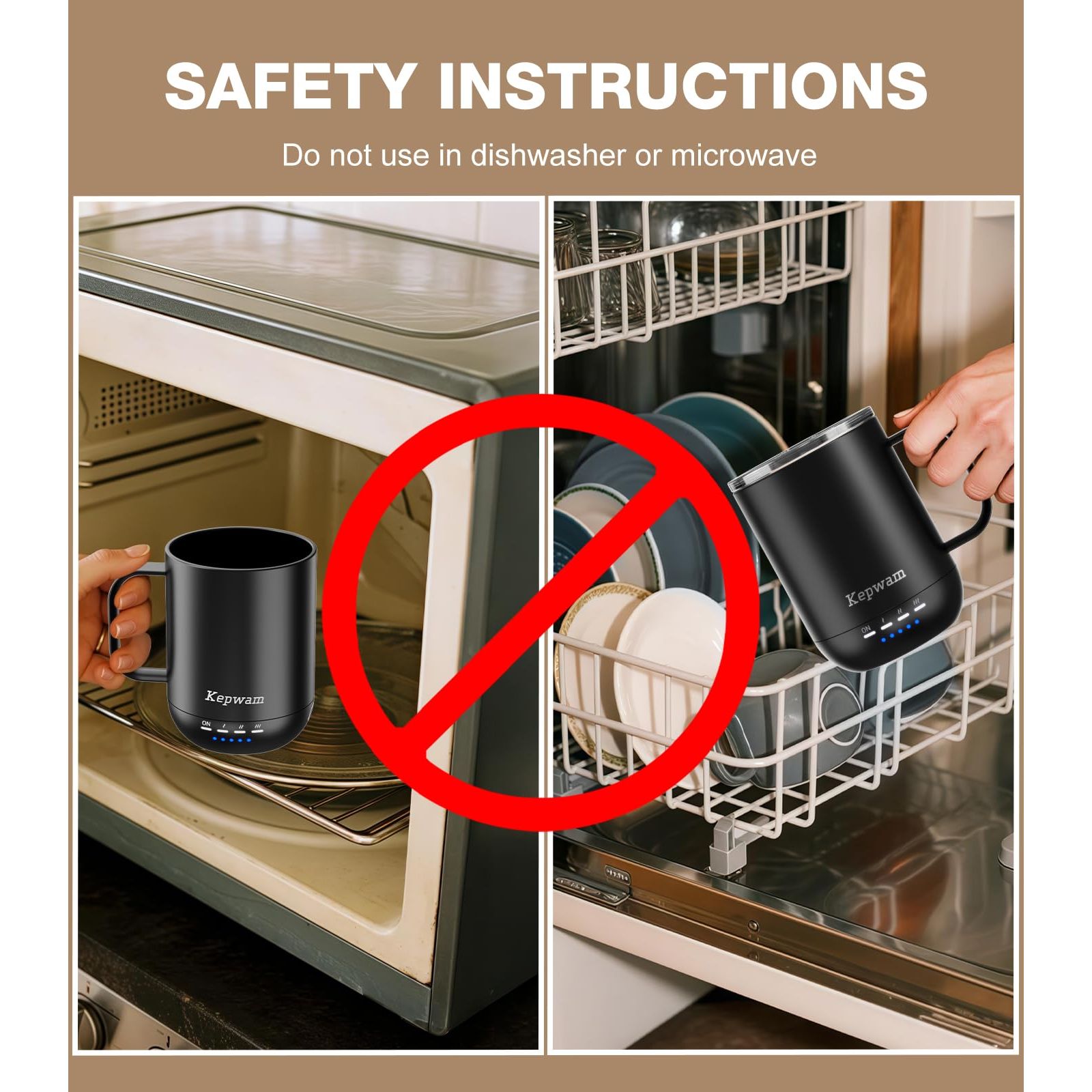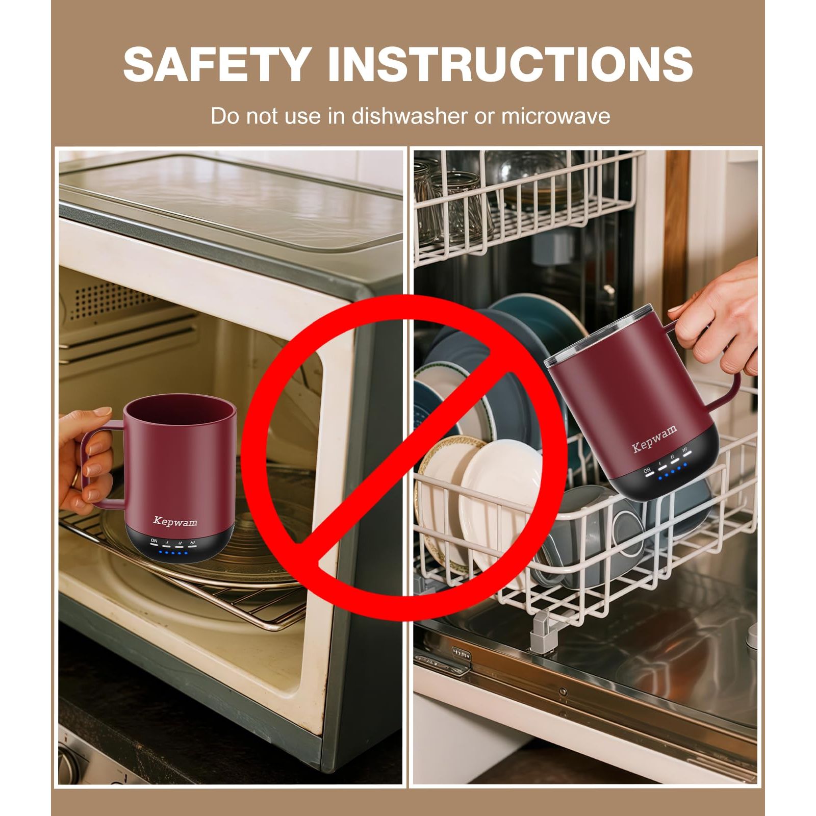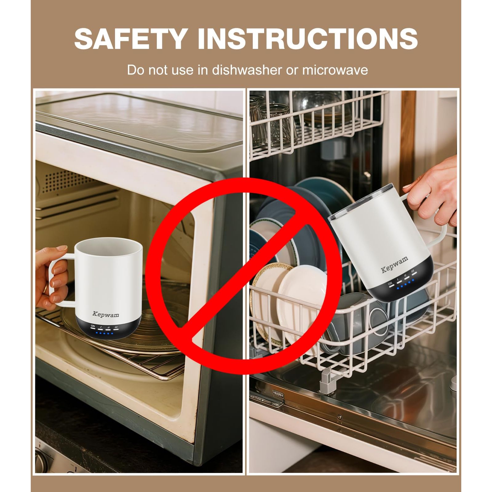 What’s Included - A Kepwam temperature control mug, a rechargeable coaster, a dedicated charging cable, a spill-proof lid and instruction manual. Note: Hand wash only. Do not place in dishwasher or microwave, as this may damage internal wiring, impair the heating function, cause safety risks (such as melting or electrical hazards), and reduce the product’s lifespan