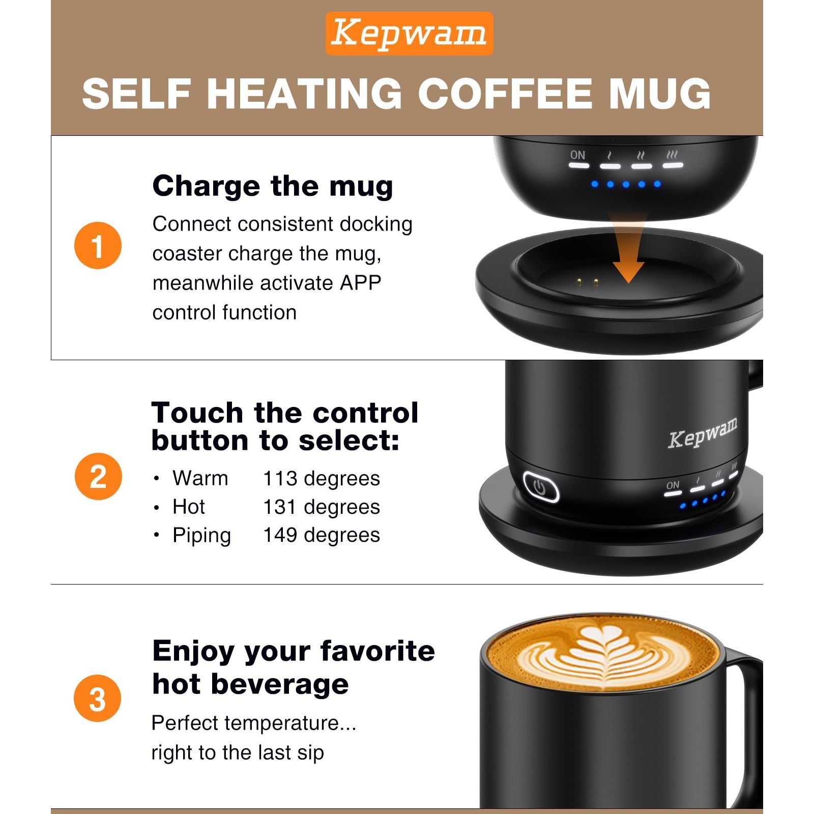 Heated Coffee Mug - Kepwam heated mug enhances your hot beverage experience with three temperature options: warm (113°F), hot (131°F), or piping (149°F). Enjoy consistent warmth for hours. The included sliding lid helps retain heat and prevent spills. Features a 14 oz capacity (12 oz with lid on)
