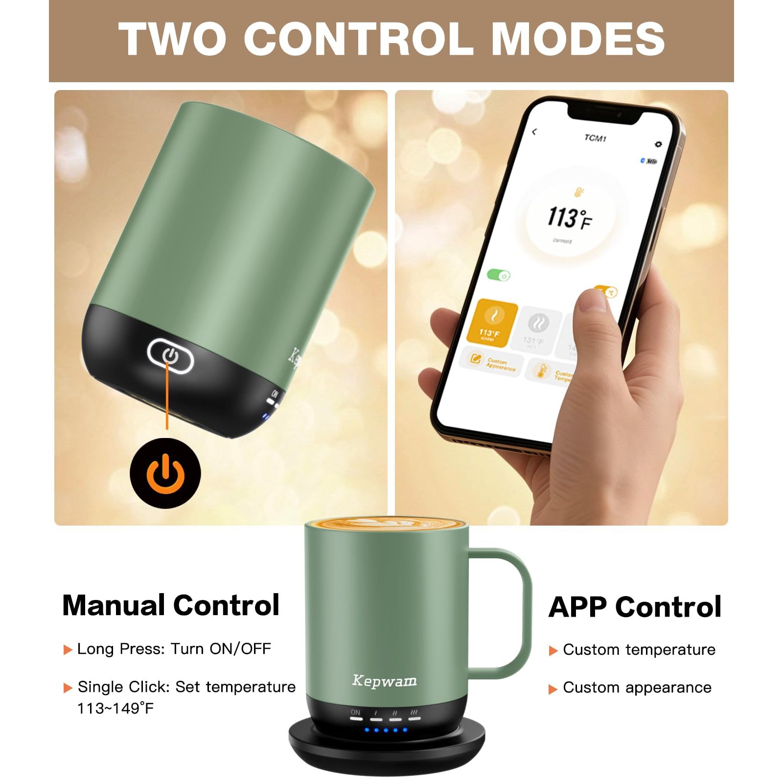 Dual-Mode Convenience - This self-heating coffee mug offers two temperature control options: easy one-touch manual control or pairing with the Kepwam app. The app shows real-time beverage temperature and lets you remotely adjust settings and customize appearance. Switch between modes to suit any situation—at home, office, or on the go—and enjoy your perfect warm drink effortlessly