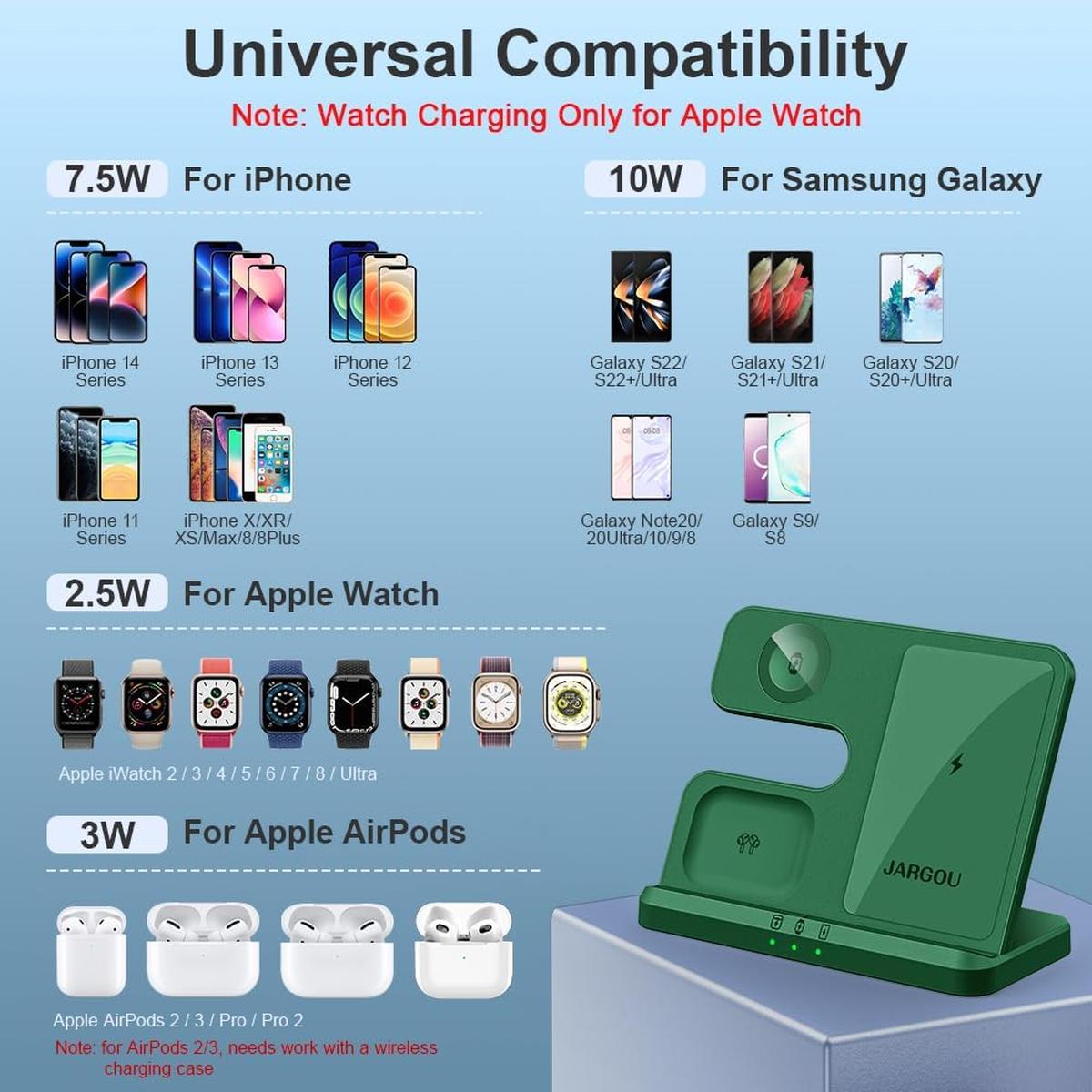 The JARGOU Trio Charger also has built-in safety features to prevent overcharging and overheating, ensuring the safety of your devices. It is made with high-quality materials, making it durable and long-lasting.