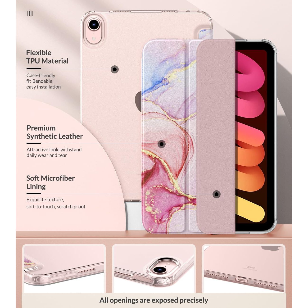 Elevate your iPad Mini 7th Gen with the stunning MoKo Light Pink Gold Marble Case, designed to provide both style and protection. This exquisite case features an elegant marble design, blending soft pink hues with shimmering gold accents, making it the perfect accessory for fashion-forward individuals.