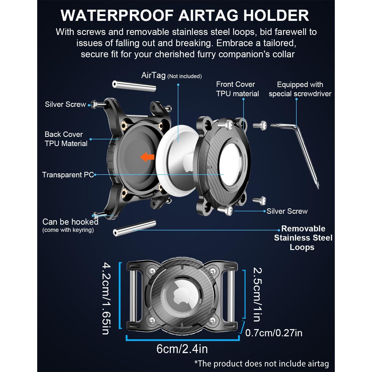 Dog Airtag holder equipped with a special screwdriver and 8 M2*6 screws, copper nut rotary seal and 2 removable metal loops(bars). It will not leak or damage and will not affect the signal when it is 6 meters underwater. Hard, Extra Durable and Wear-resistant. Airtag holder for dog collar made of high-quality TPU material, strong and not easy to broken.
