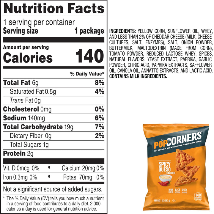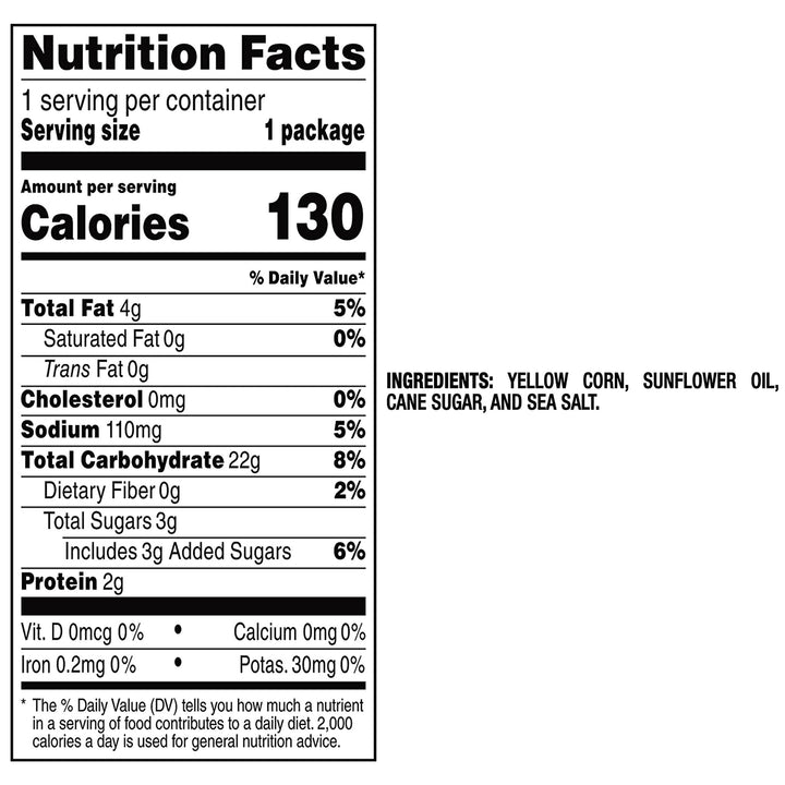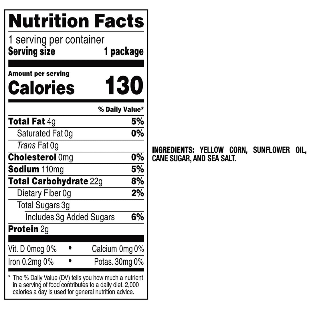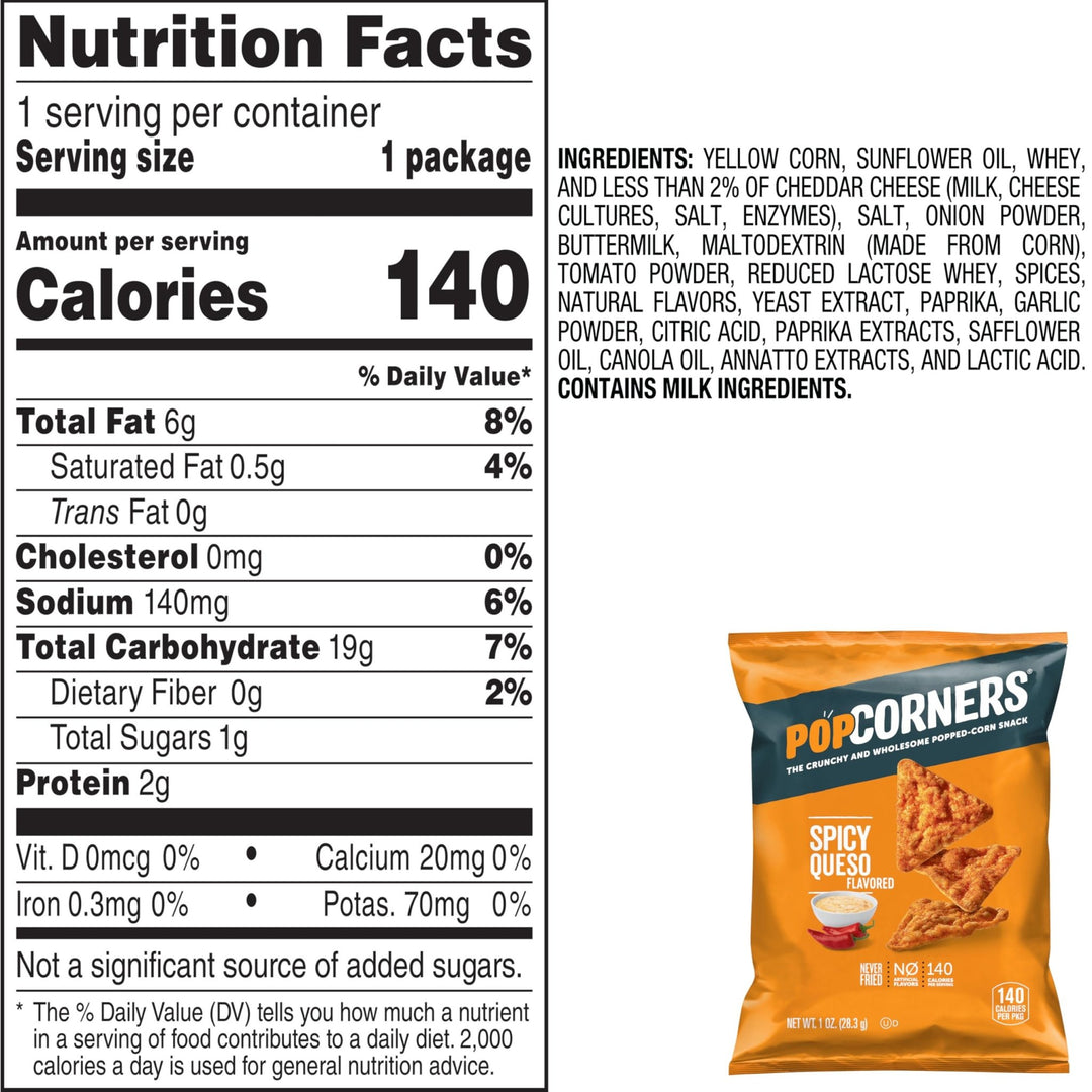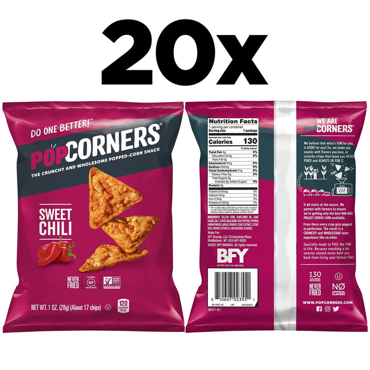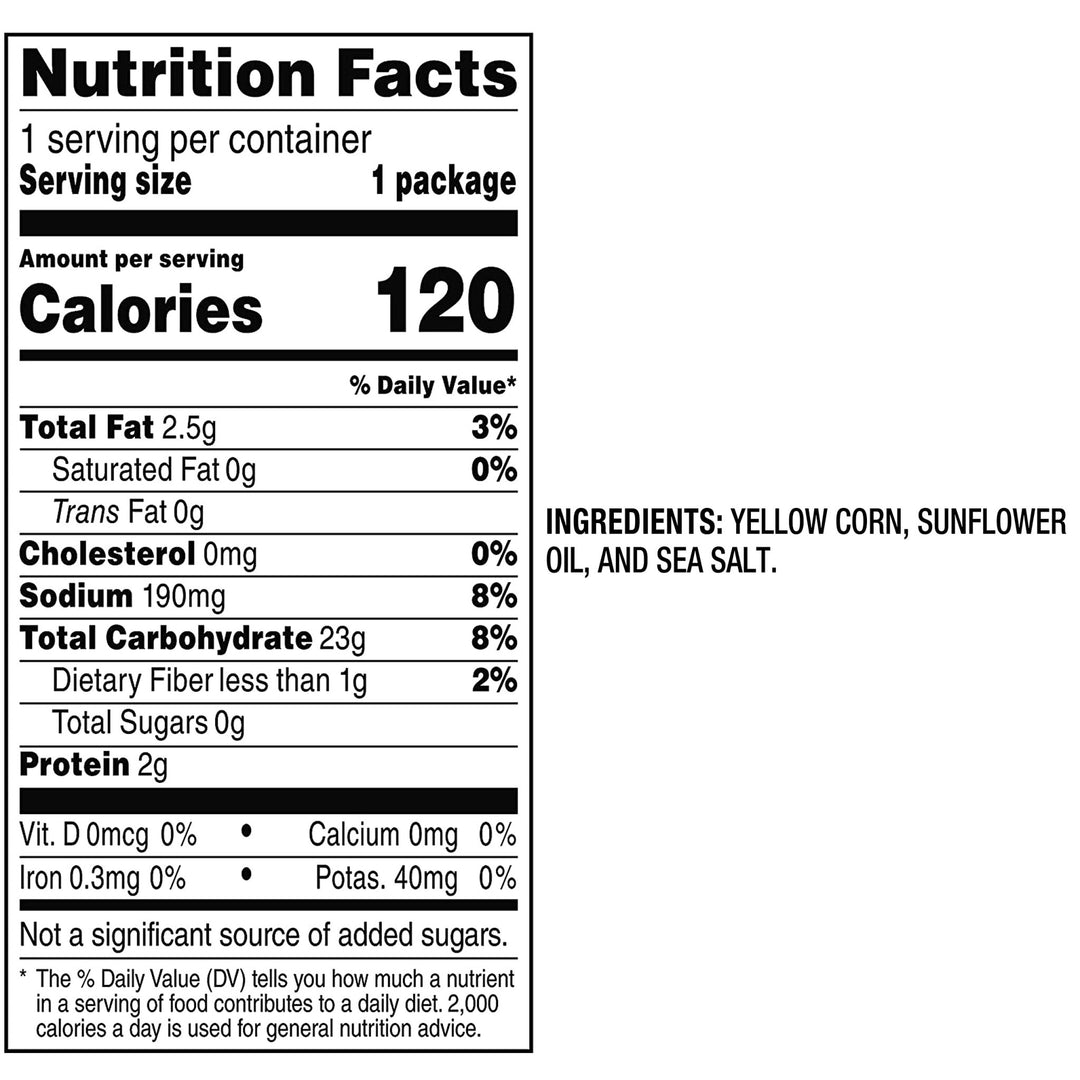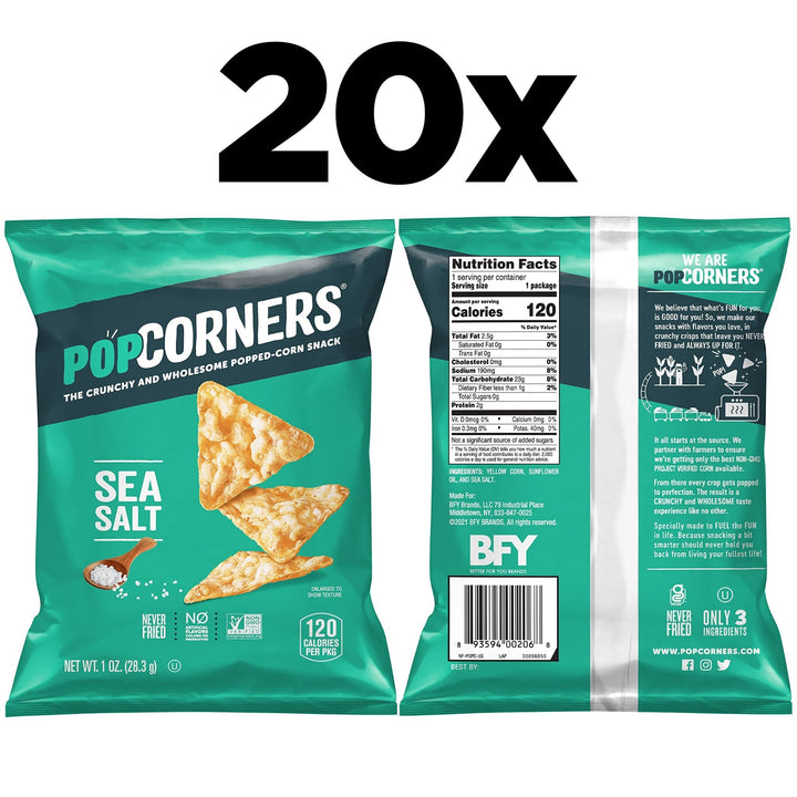 Our PopCorners are the perfect snack for any occasion - whether you're looking for a quick bite on the go, a healthy option for movie night, or a crowd-pleaser at parties. Made with all-natural non-GMO ingredients, our chips are gluten-free, vegan, and contain no artificial flavors, colors, or preservatives.