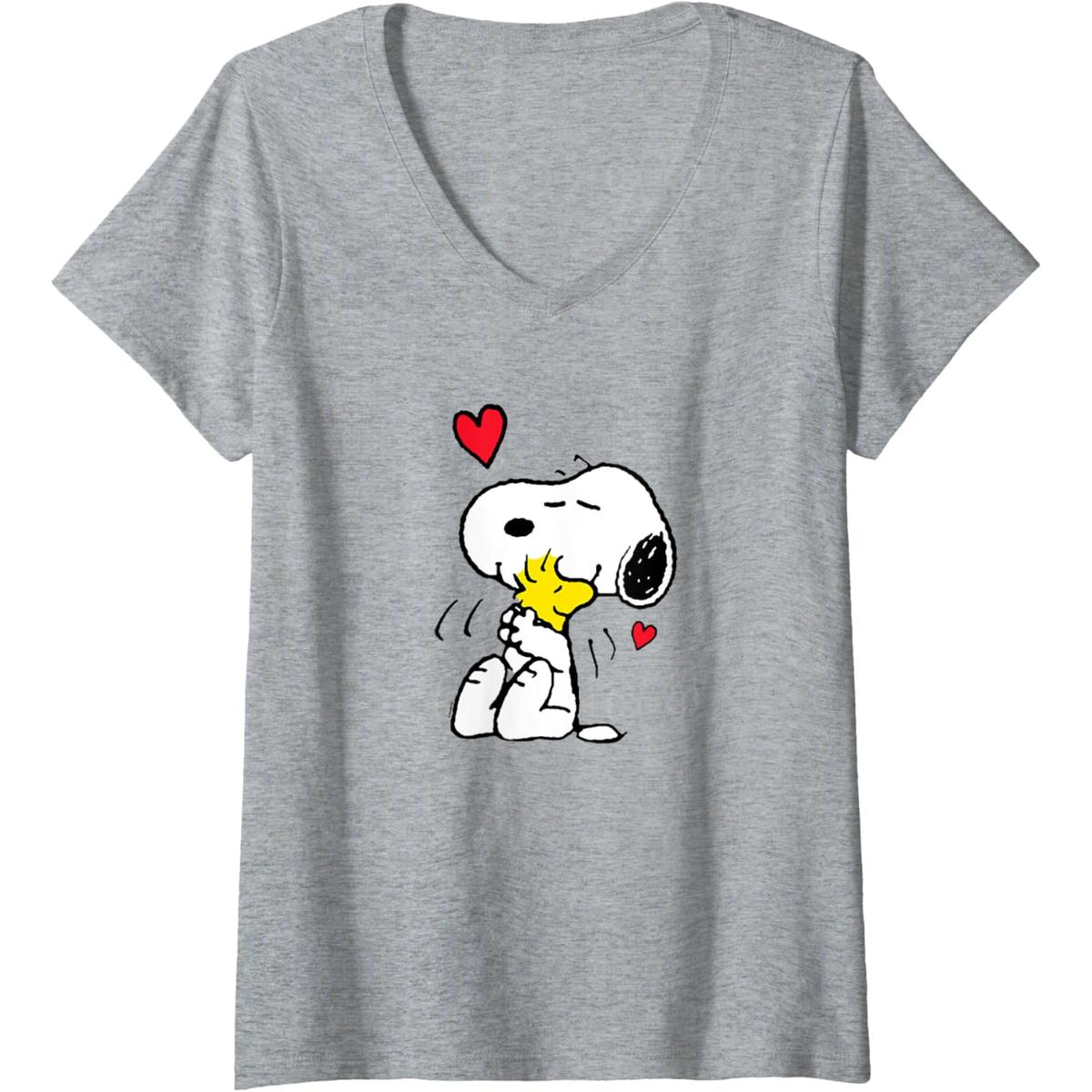 The V-neck design adds a touch of femininity, while the relaxed fit allows for comfortable movement and breathability. The graphic print features Snoopy, the lovable beagle from the beloved Peanuts comic series, holding a heart with the word "Love" written on it. This cute and playful design is sure to bring a smile to anyone's face.